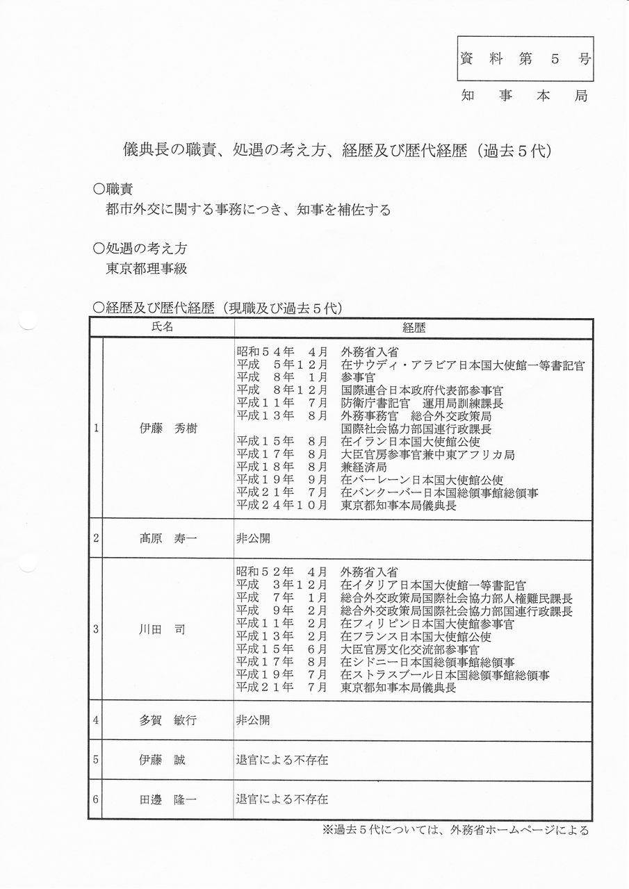 知事本局長(当時)より「外交官としての豊富な経験、知見が有用であることから、都では、儀典長を外務省から採用」との答弁を頂きましたが(詳細過去ブログ外務省→都庁への天下り指定席?!「儀典長」を問う!ご参照)どうにも腑に落ちず、その後、以下情報公開請求を敢行致しました。