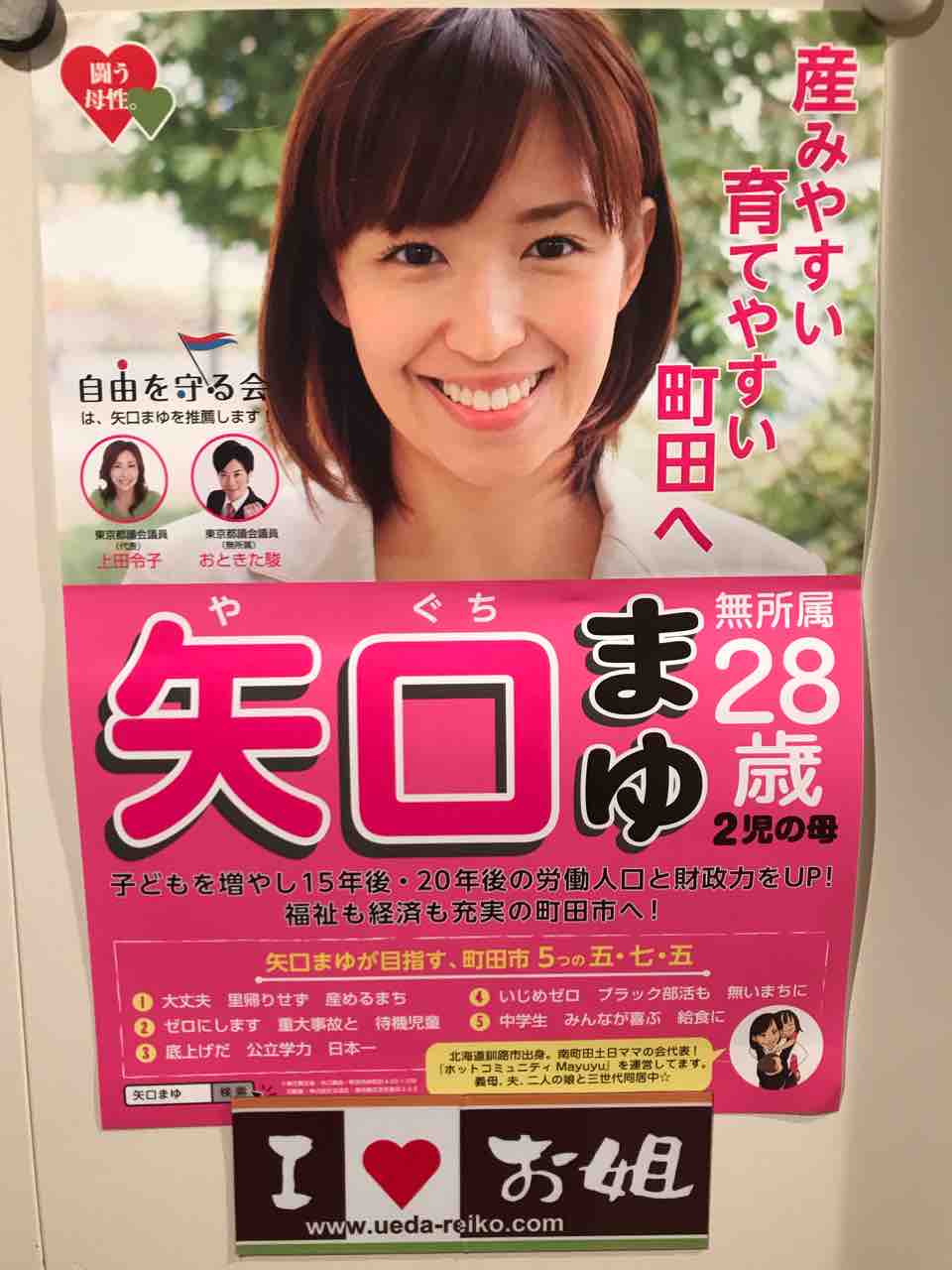 当日は、多くの子ども連れの若いご夫婦が立ち止まって、まゆさんのポスターをじっくりと見入っていたと、町田市民の方から情報を頂きました。地盤(既存名簿・地域組織)も看板(国政政党の公認)もカバン(お金)もなく、名簿は制度に従って選挙人名簿を選管で書き写し、電話かけもしない、しかもポスター面積の半分が政策という挑戦でしたが、強い信念に基づいた戦略が功を奏したことが実証されました。このことは、乳幼児を抱える母親でも地方議員に挑戦をできる善き先例となったのではないでしょうか。2007年私が同じように、選挙事務所にベビーコーナーを設けて、候補・支援者共に母親で、しがらみのない手弁当の選挙を乗り越えて、江戸川区での地方政治の世界へのハードルを下げたように、2018年の町田で前人未踏の足跡を、まゆさんとともに地域政党「自由を守る会」が残せたことが、小さくて大きな初めての「はじめの一歩」であったと、メンバー一同自負しております次第です。