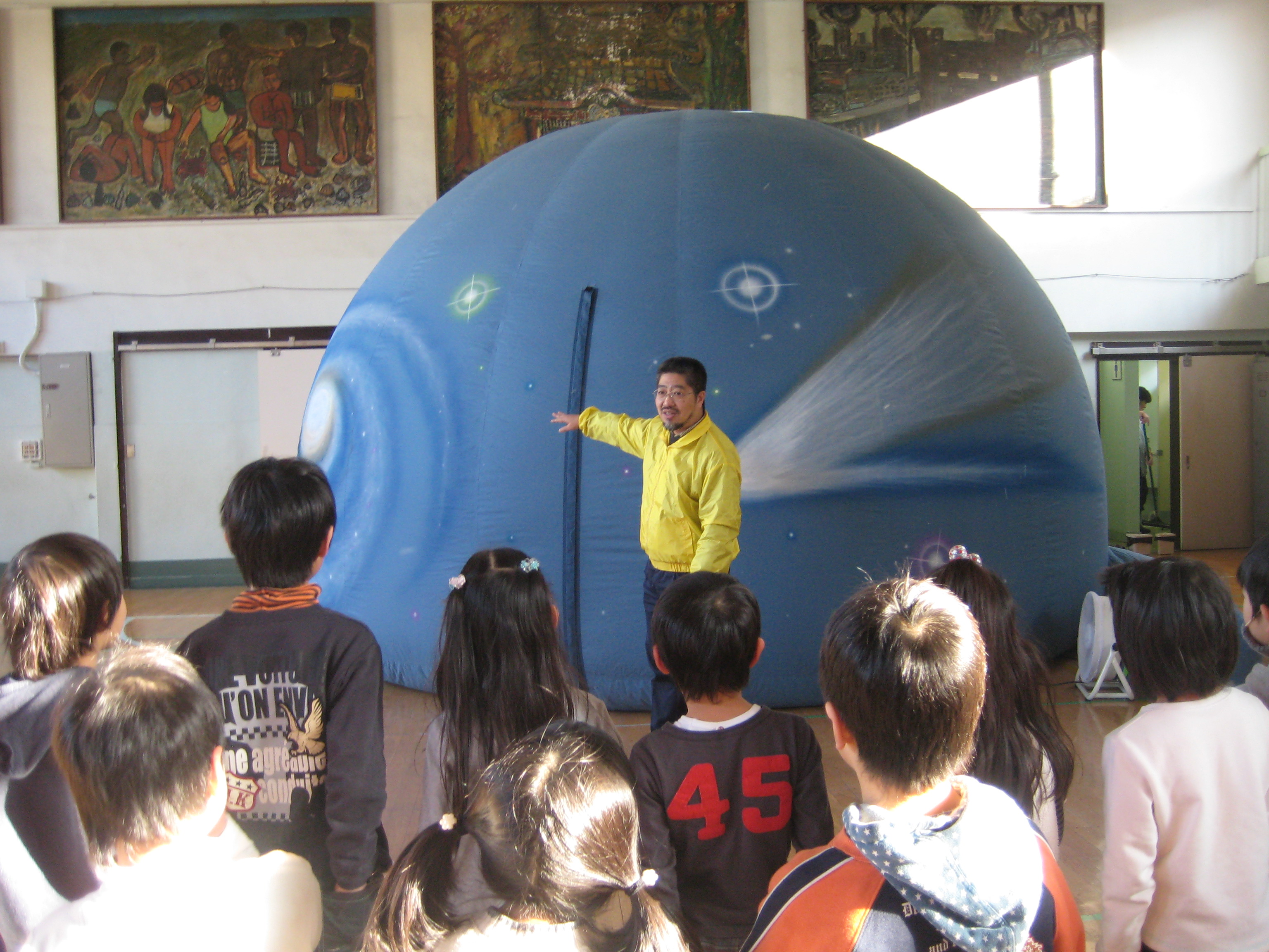 ヘタりそうな心をひきたてながら午後からチャリをすっとばし船堀小学校へ。お姐が発足当初から関わっている江戸川版全児童放課後対象事業すくすくスクール(1月12日に地域づくり総務大臣表彰をいただきました!←関係各位、地域の皆様おめでとうございます!)のワクワクする企画(←起案byお姐)。区内在住の木村直人さんによるモバイル(移動)プラネタリウム「星の宅急便」がやってくるからです。