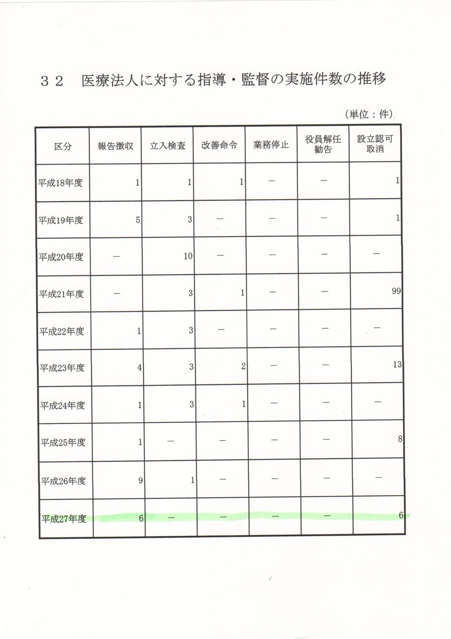 残念なことに、大臣から指摘があっても当該医療法人に立ち入り検査という正義の公権力の「メス」は入れられていなかったことがわかりました。そもそも五千を超える医療法人があるというのに、立ち入り検査や改善命令、業務停止、役員解任勧告実績の少なさに、隠ぺい体質が読み取れるような気がして驚嘆せざるを得ません。