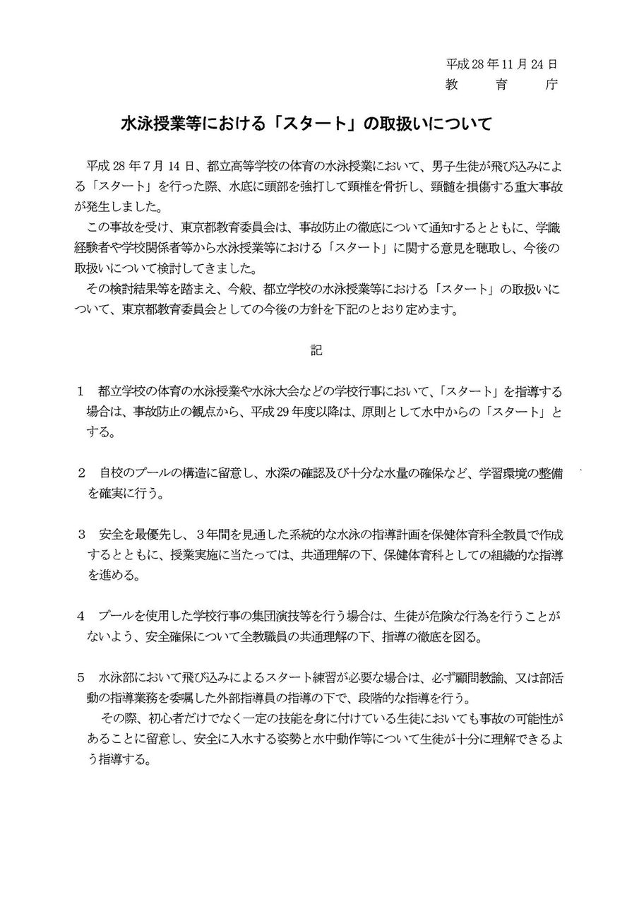 「水泳事故の対応状況と再発防止についてでございますが、今般、当該都立高等学校において、教員の不適切な指導により重大事故が発生したことは、まことにざんきにたえないことであり、当該生徒さんとご家族に対しまして、心からおわびを申し上げる次第でございます。今後、関係者の処分につきましても、厳正に対処していく考えであります。
