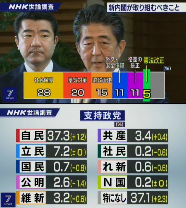 政党支持率で伸びたのは共産党と自民党か……。(画像はNHK NEWS7から)