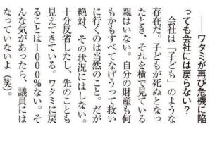 最近も、嬉々としてマスコミの取材受けてるからな。1000%戻らないとか言っておきながら。ブラック企業って人格破たん者にしか経営できないんだと思う。