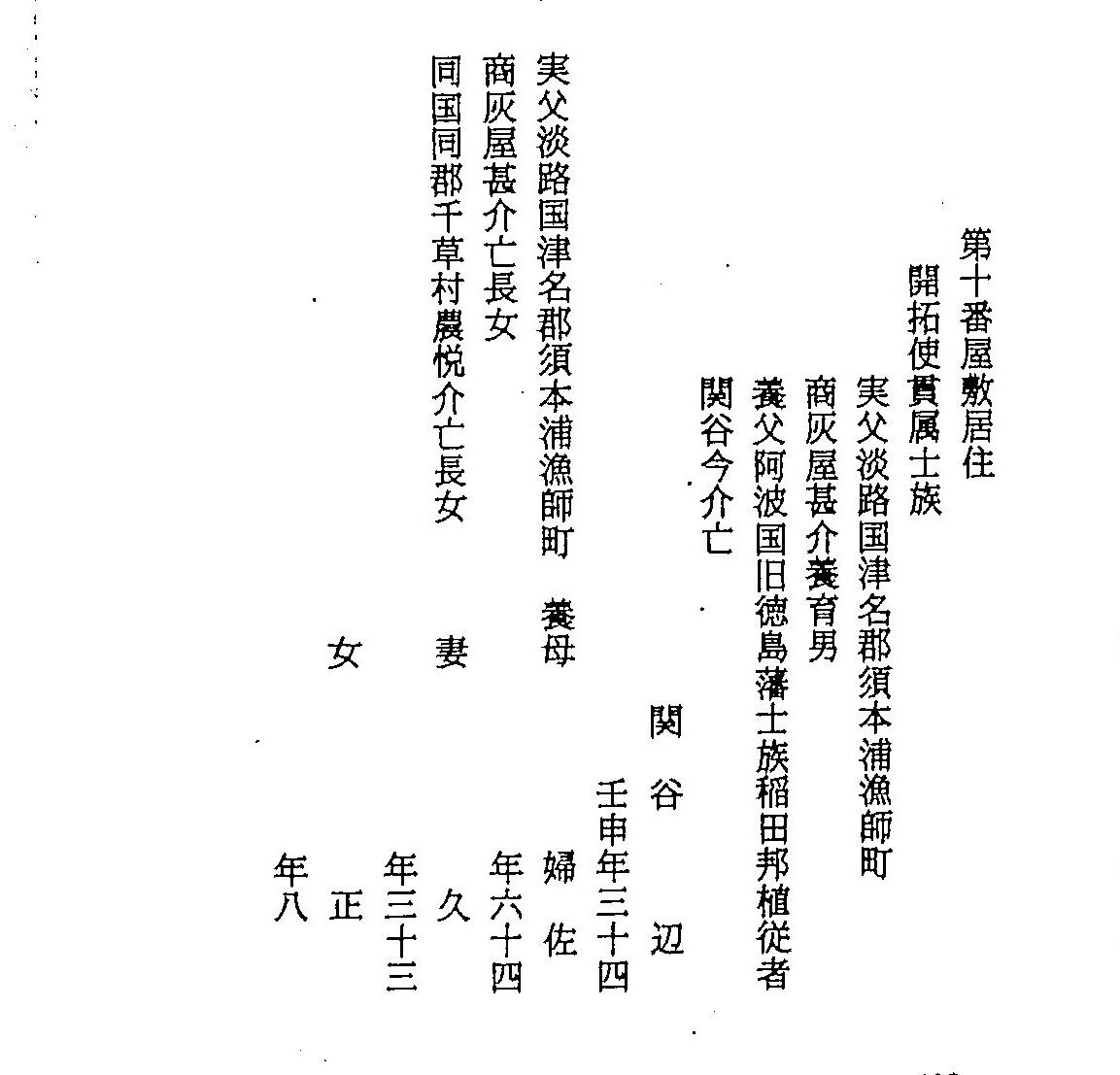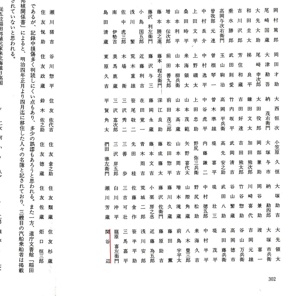 岡本太郎の曽祖父の関谷辺は江戸時代洲本では芳崎文十郎という名前だったらしい、そして太郎の祖母正も洲本では志能だったものを正に改名したようだ。そういう北海道にいってから名前を変えた武士は多数いて三吉笑吾や岩根静一、三吉歩などもそれにあたる、三吉笑吾は名前を変えた理由を旧に復したとしているので、稲田家の家臣に仕官する時、蜂須賀家と戦った過去があり三吉姓を遠慮して使わなかったのかもしれない。先祖から伝わる元の名前を廃藩置県により、稲田家家臣でなくなると明治5年の戸籍への登録時に関谷辺も改名したものとおもわれます。ただ志能は正になぜかえられたのだろう一人娘のため跡取りとしての思いがこめられてだろうか。関谷辺は洲本では下屋敷通りに住んでいた下級家臣で北海道移住後は静内では農業はあまりせず開拓使(北海道庁の前身)に務めたが明治15年に開拓使が廃止され北海道が函館県、札幌県、根室県に分割されると函館県の役人となり函館にいたらしい、岡本可亭が函館女学校の教諭としてそのころ函館に来ていて正と出会ったようだ。北の零年の移住のメンバーに正がいなければ日本の芸術界も又ちがった風景がひろがっていたのだろうか。
