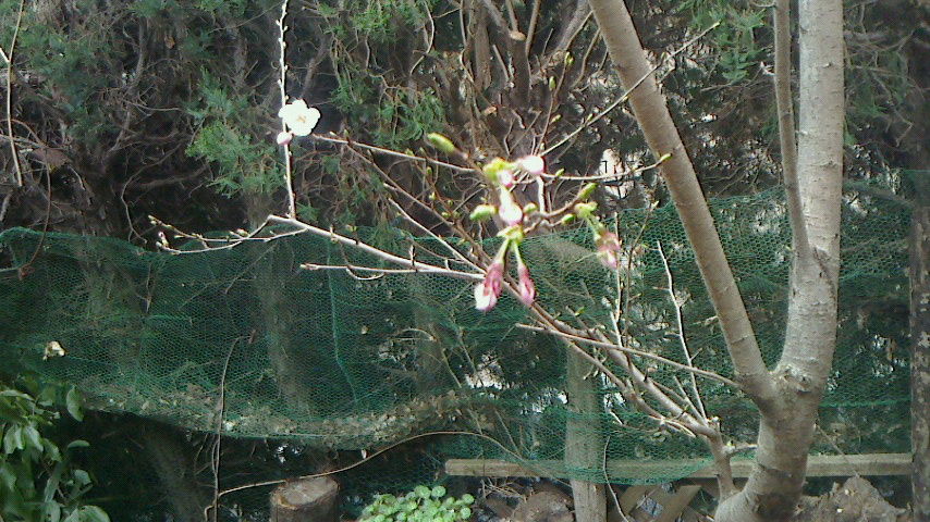 ソメイヨシノ。4年めにして初めてさきました。エランは寝ています。