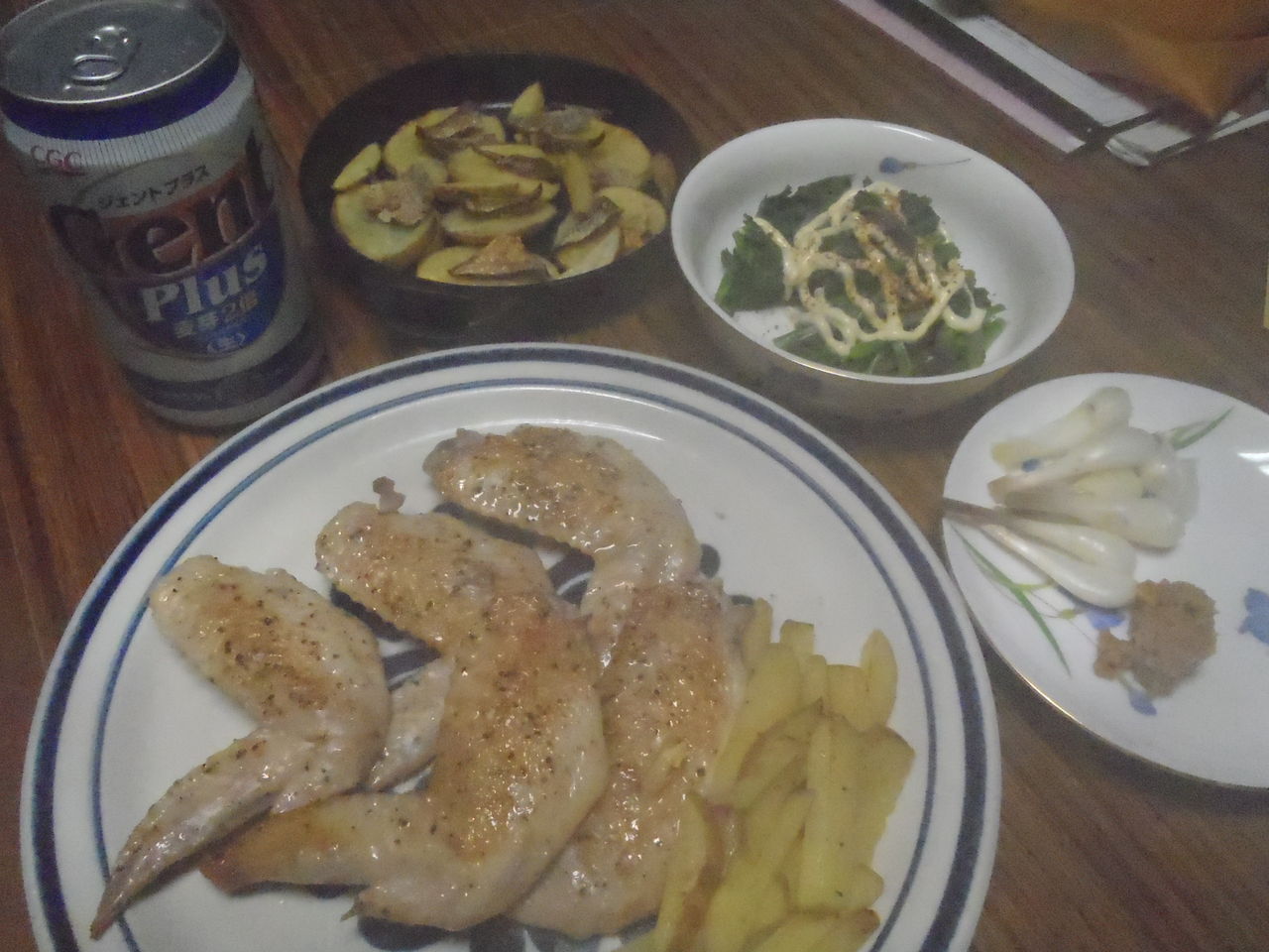 朝食:ごはん、味噌汁、目玉焼き、ウインナー、キャベツの塩麹漬け