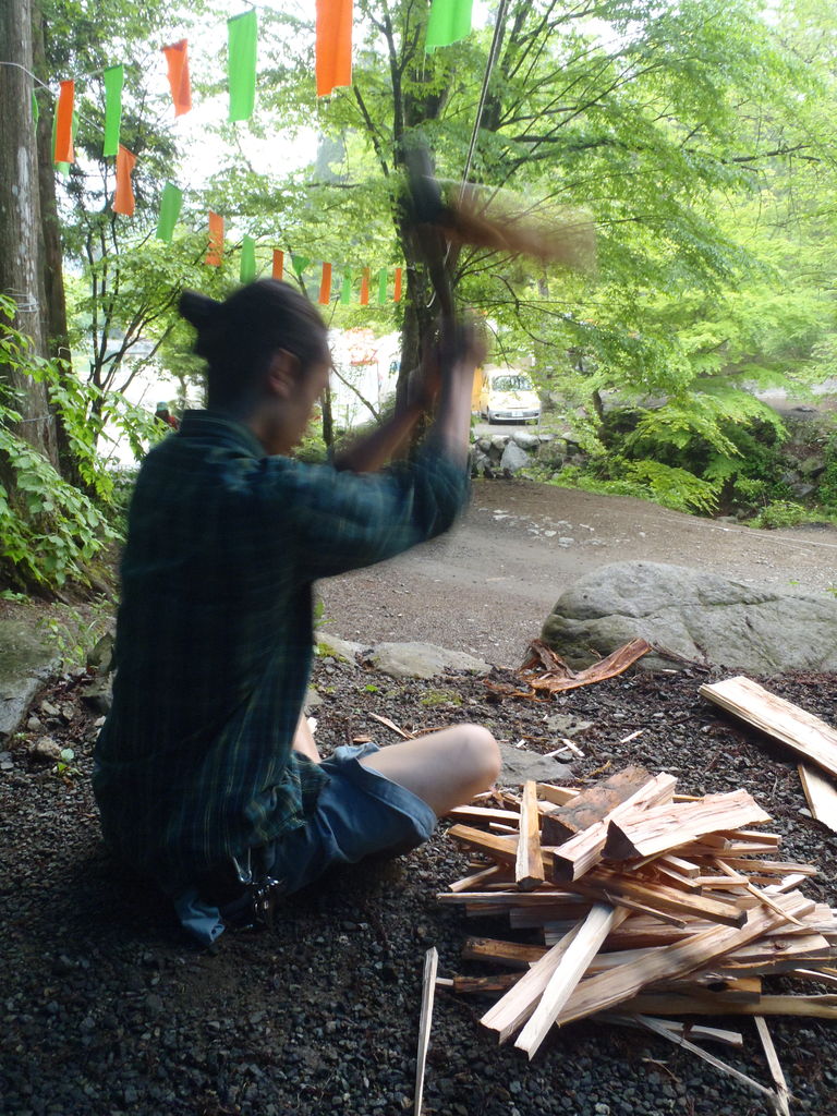 薪は間伐されて転がしてあった丸太を切って薪割りし、焚火で食事作り。