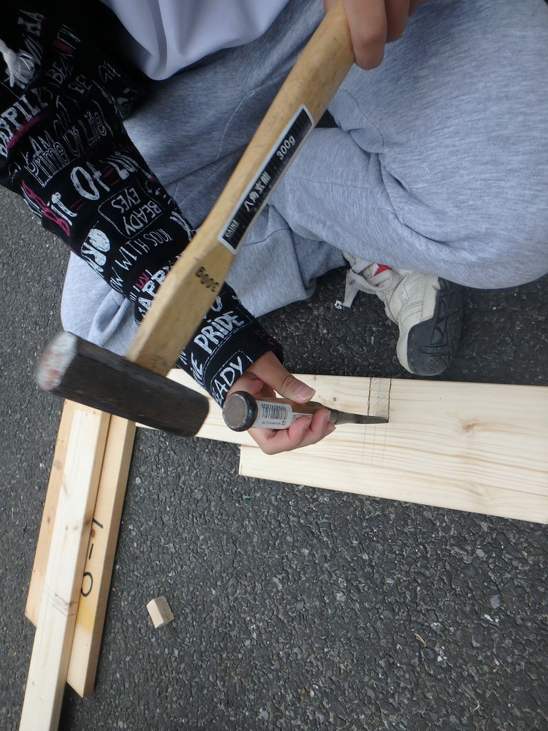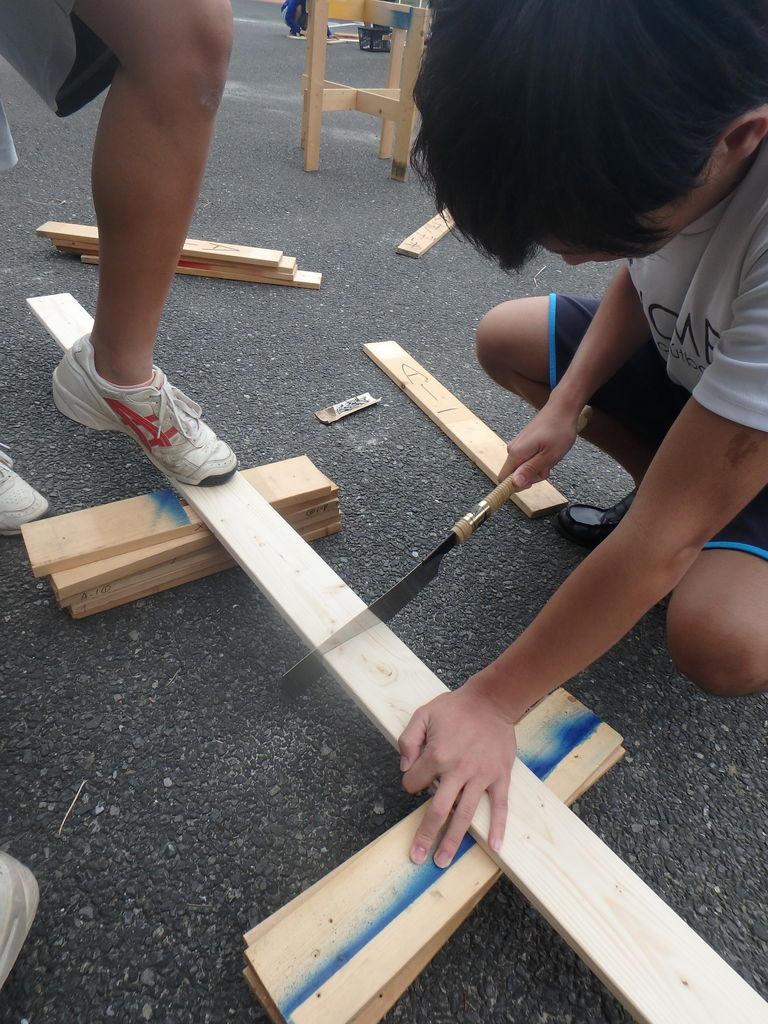 ランチの後は親子で協力して竹を使い焚火でバームクーヘンを焼こう!