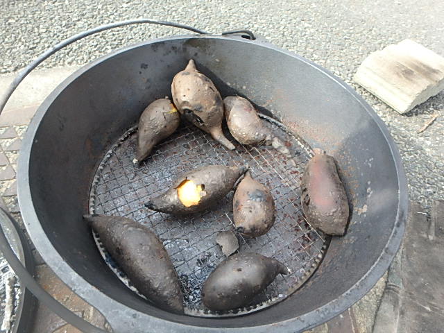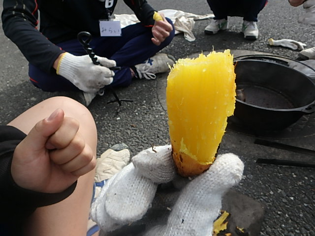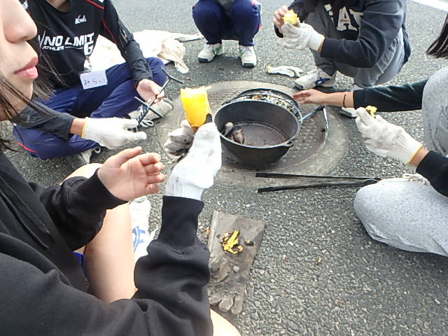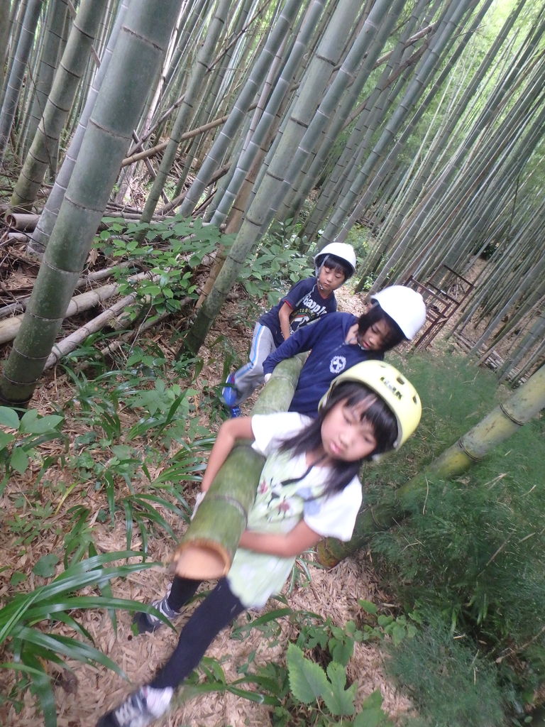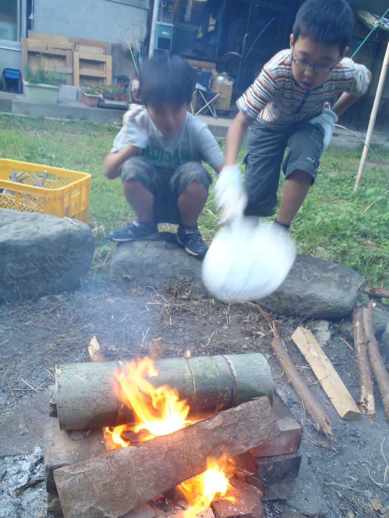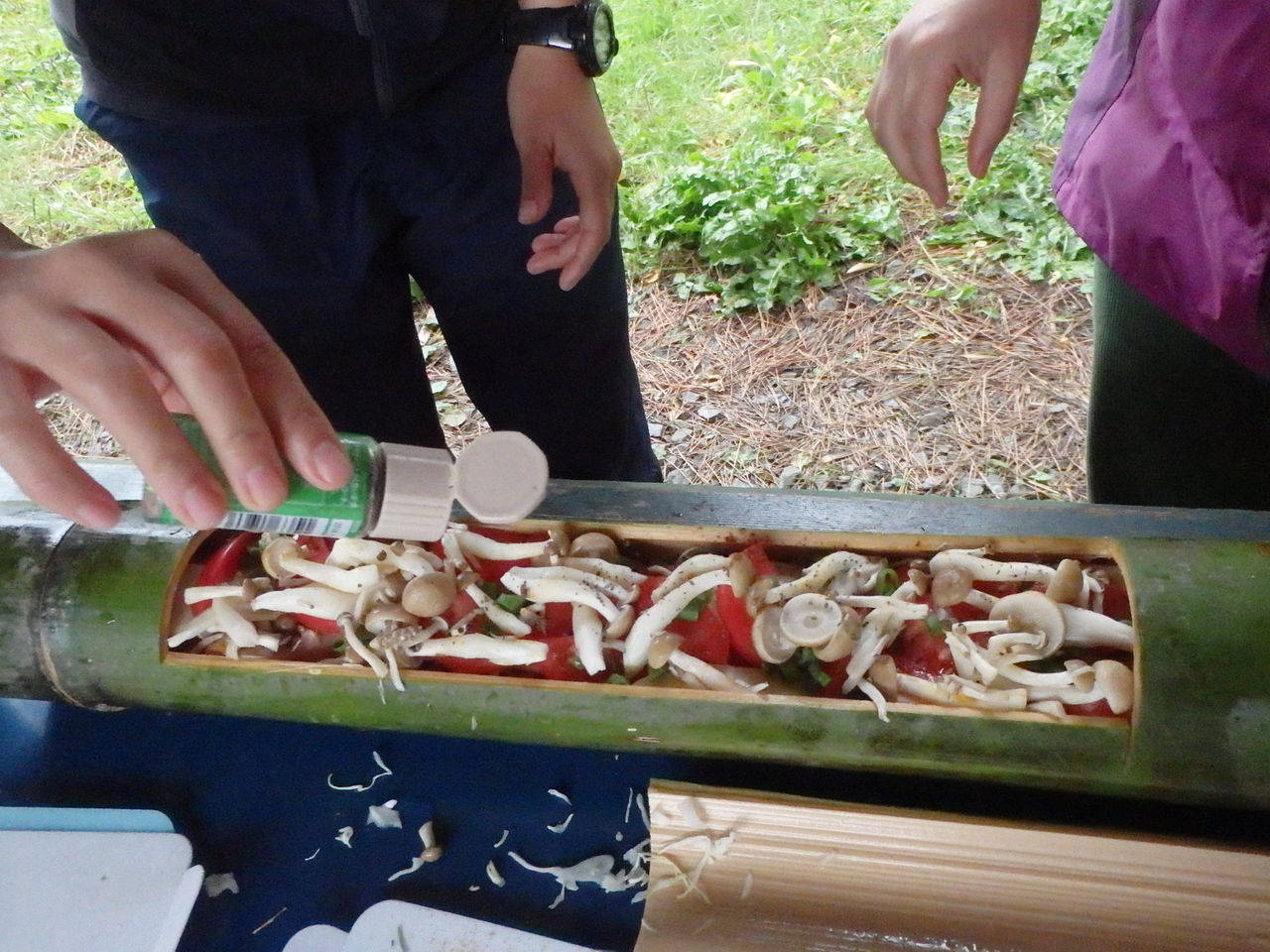切り出した竹を使い、焚き火を起こして竹筒でごはんを炊き、蒸し焼き料理を作ります。