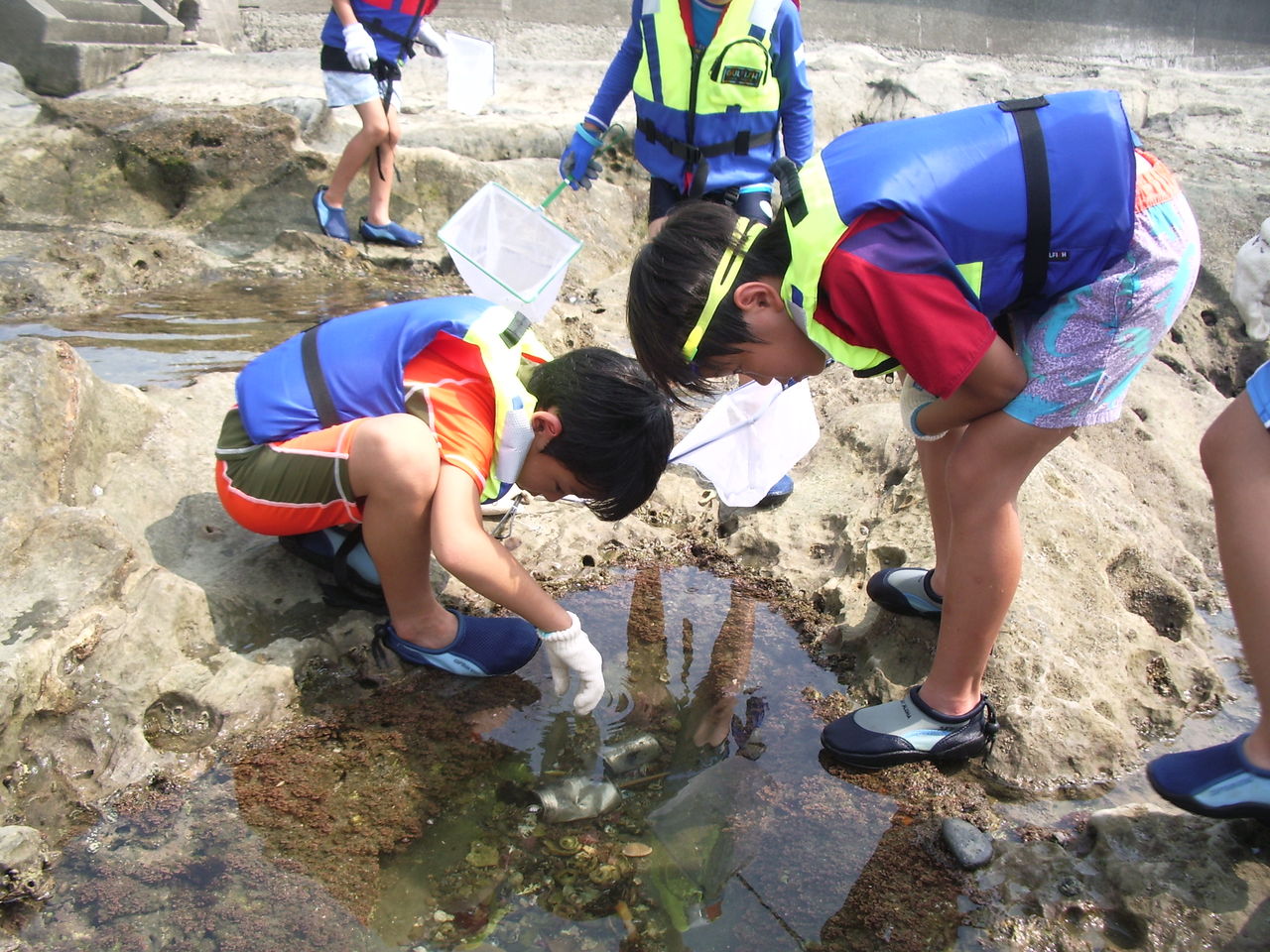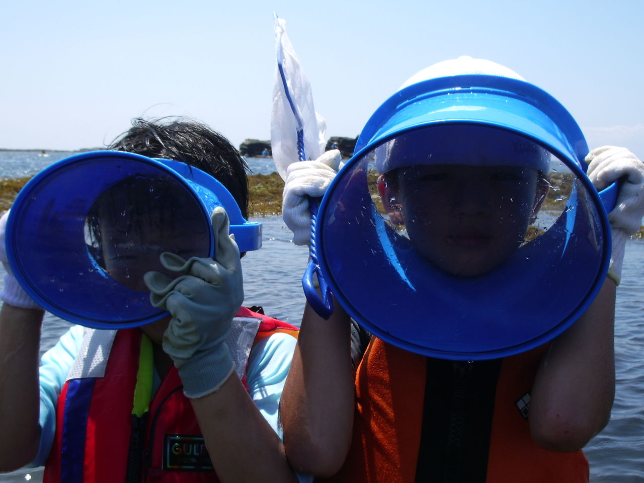潮が大きく引き、磯にできた潮溜まりで様々な生き物を探し、捕まえ、観察します。