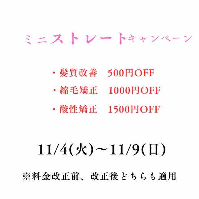 11/4(火)〜11/9(日)の期間限定でこちらのクーポンをお見せ頂くと髪質改善500円オフ、縮毛矯正1000円オフ、酸性縮毛矯正1500円オフとさせていただきます!