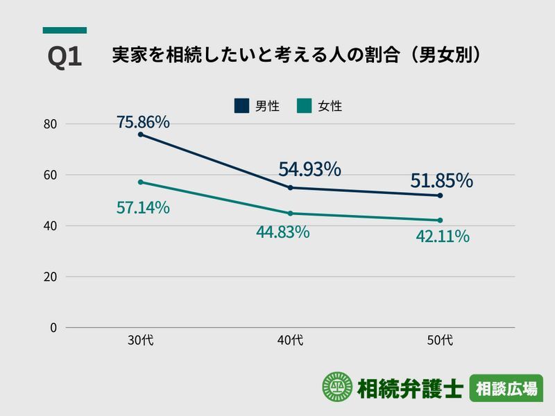 30代〜50代すべての世代で50%以上が相続したいと答えた男性と比べると女性の実家相続意向は全体に低いこともわかる。