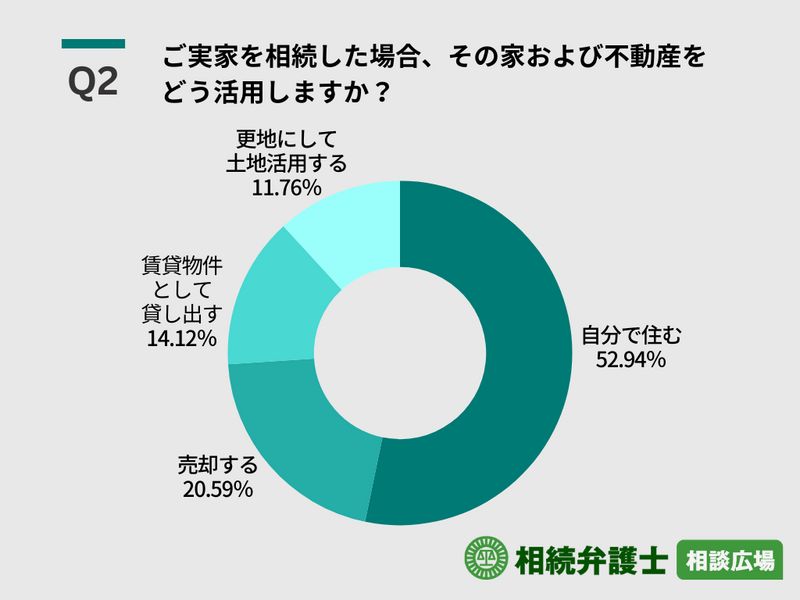 相続した実家の活用方法を問う質問では、全体の半数近い52.94%が「自分で住む」を選択。