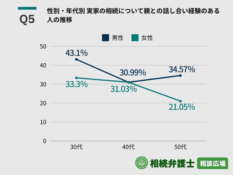 特に30代男性では比較的高い割合で話し合いが行われ、40代で一時的に話し合いの割合が減少、50代で再び増加する動きを見せた。