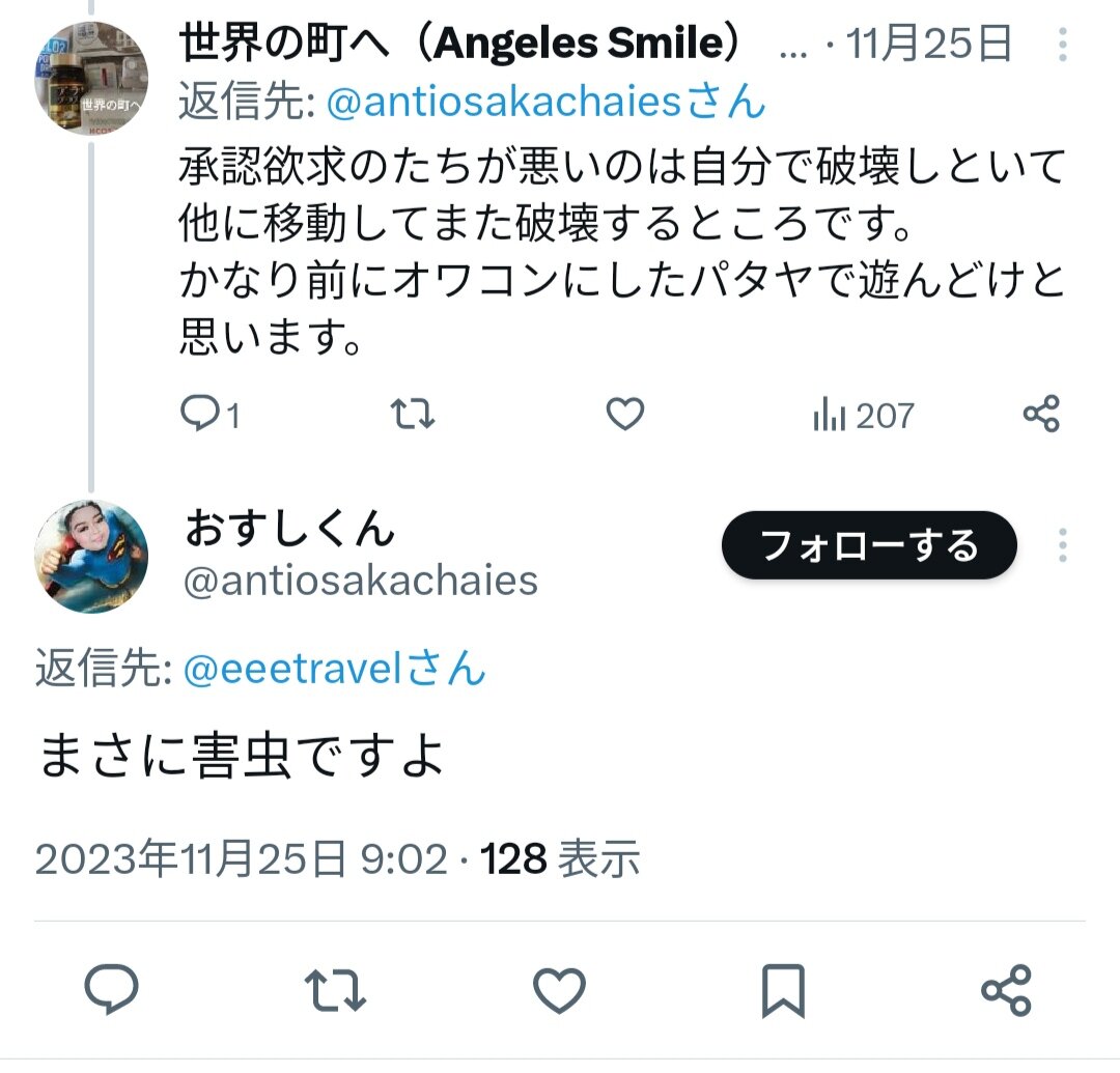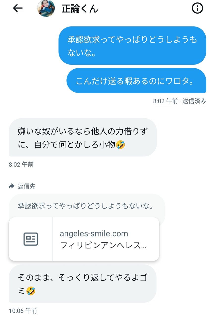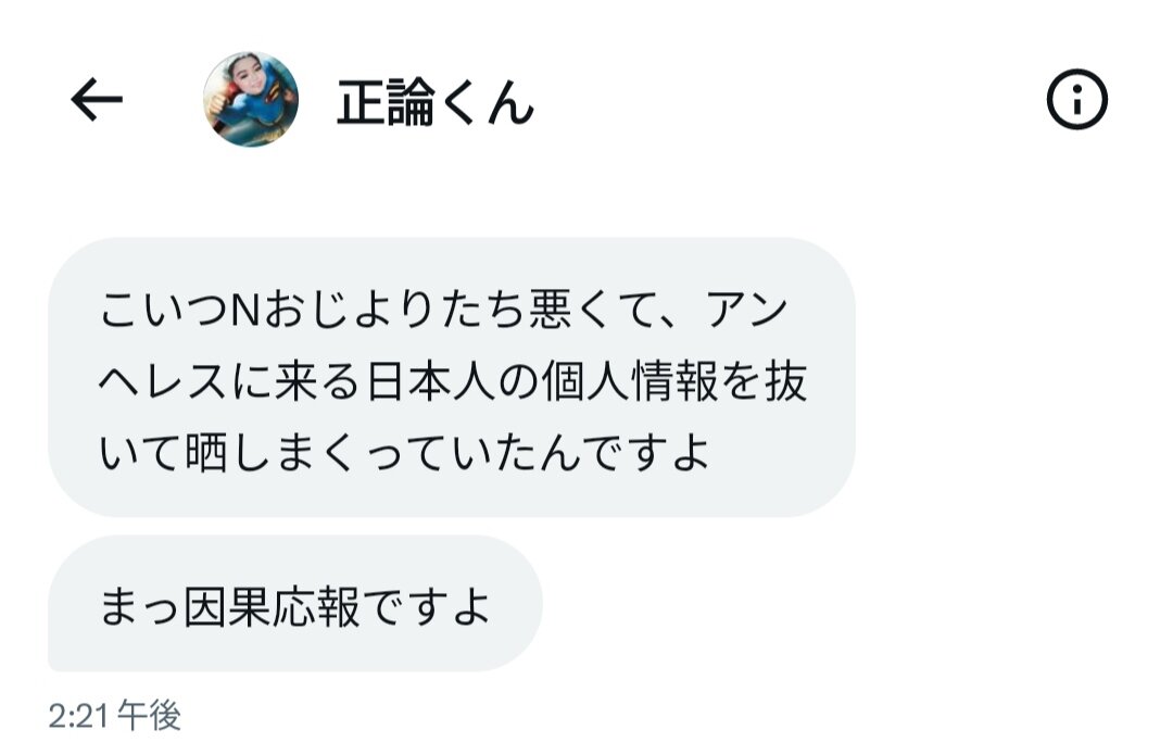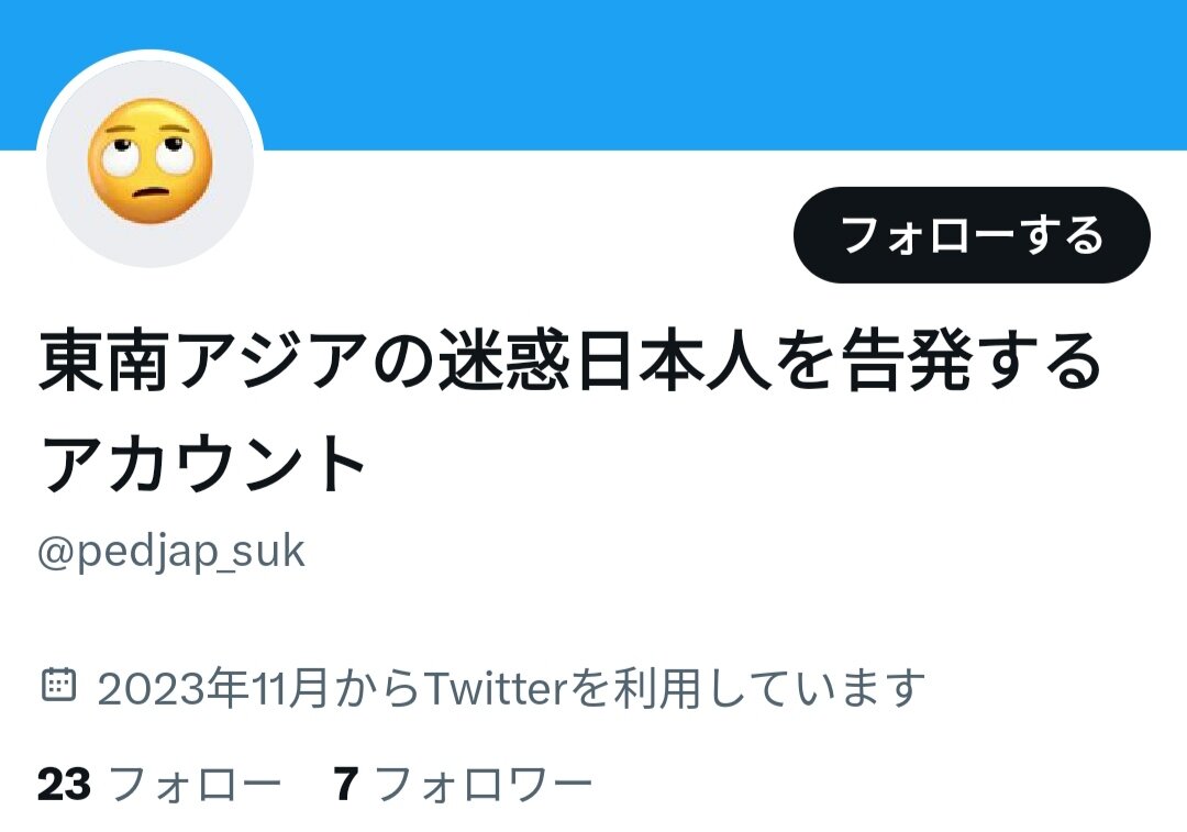 最初から相当ヤバい承認欲求とわかってたけど、捨てアカ日本人さらしだけでなく数年前にアンヘレスで遊んでた人をネットで攻撃しまくってたグループの仲間だと12月初旬にわかり、さらに絶句した。そのグループの一員に数年前に粘着されまくってたから、今でも痛いツイートがTwitter(X)に山ほど残っている。