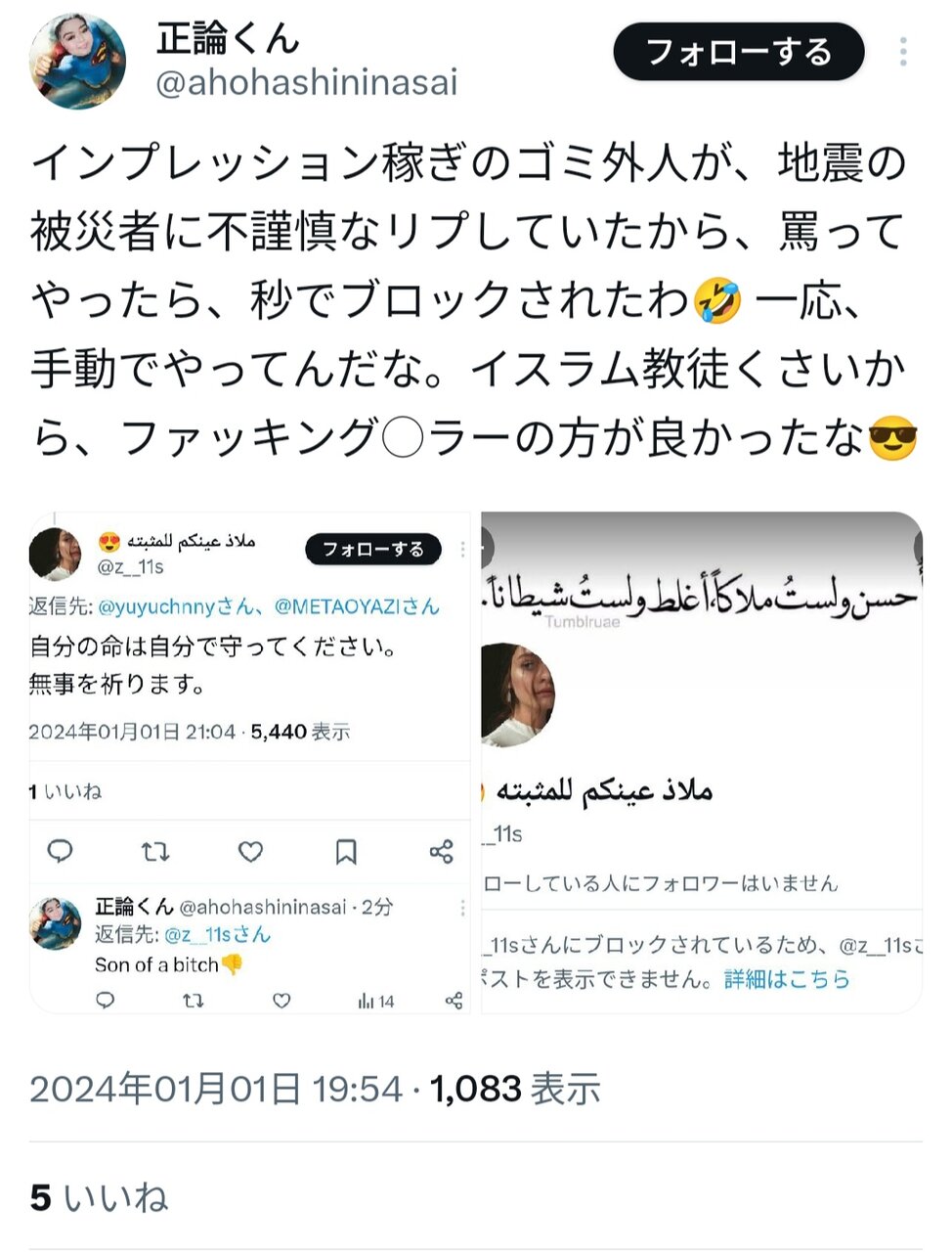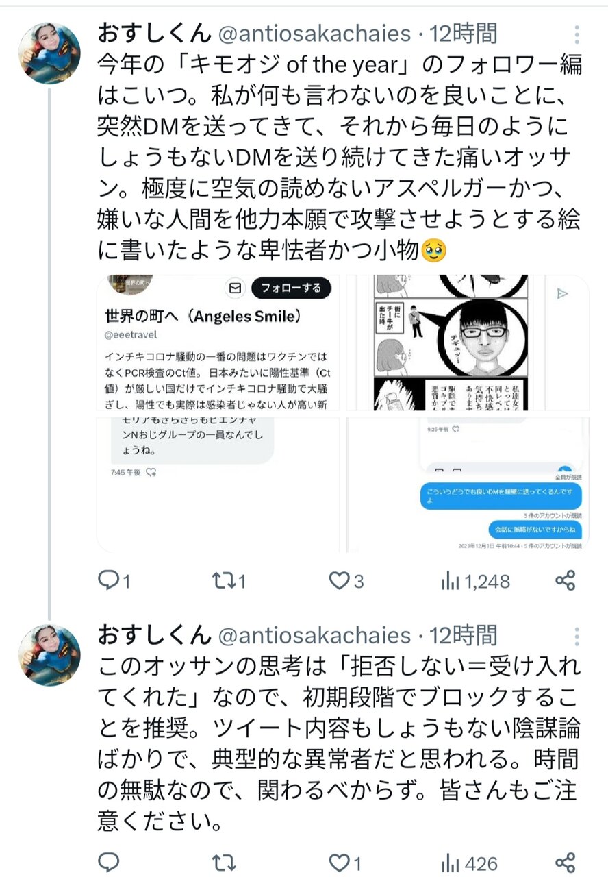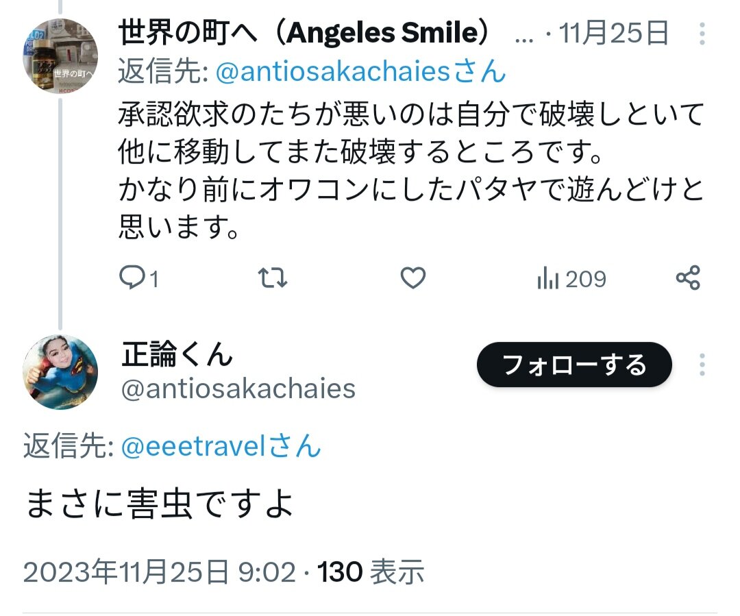 最初から相当ヤバい承認欲求とわかってたけど、捨てアカ日本人さらしだけでなく数年前にアンヘレスで遊んでた人をネットで攻撃しまくってたグループの仲間だと12月初旬にわかり、さらに絶句した。そのグループの一員に数年前に粘着されまくってたから、今でも痛いツイートがTwitter(X)に山ほど残っている。