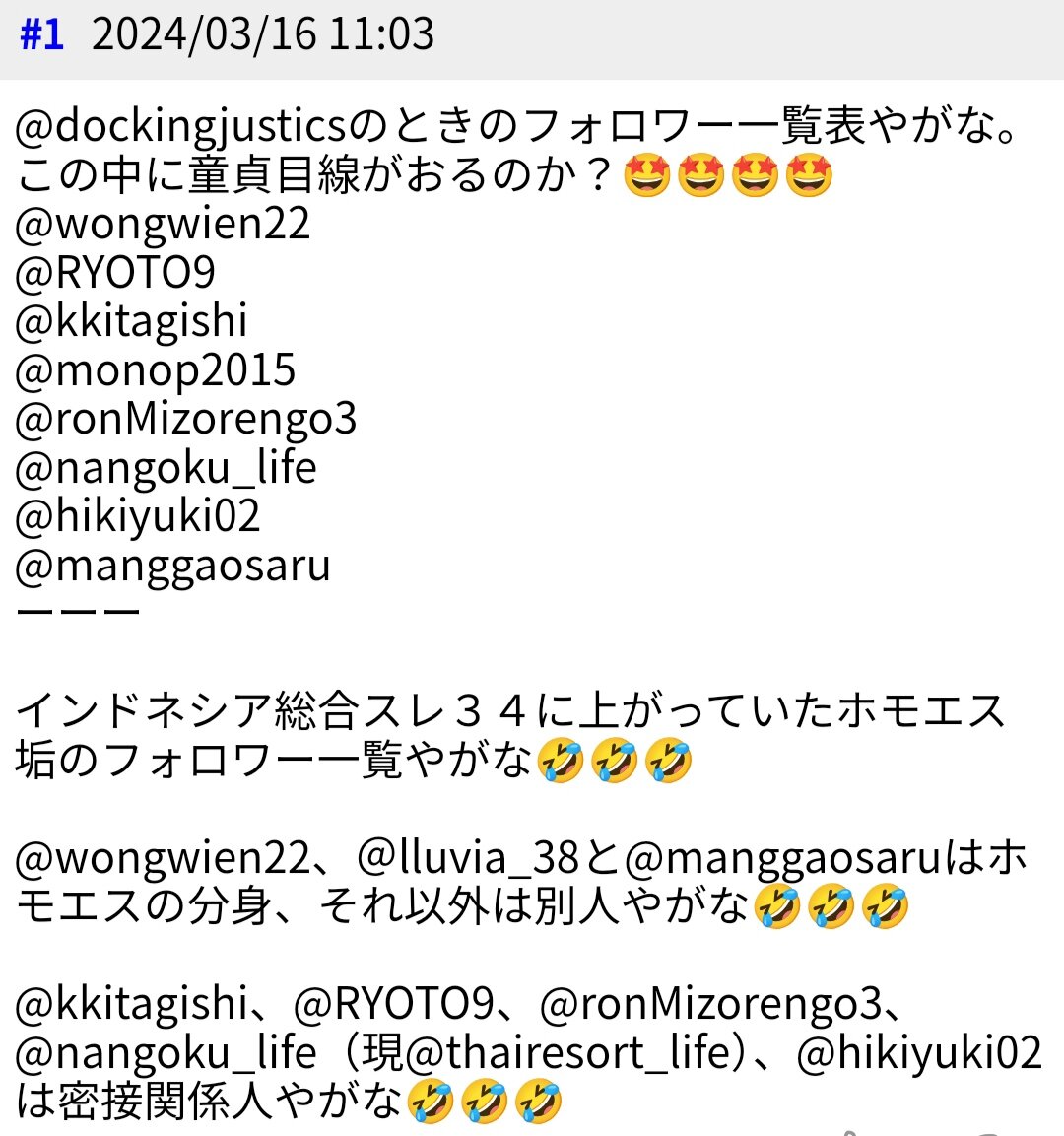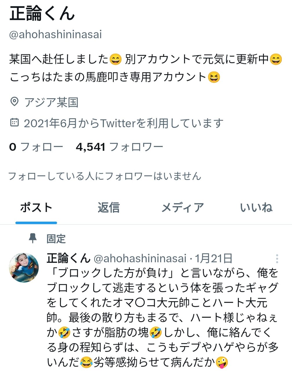 数年前からグループでアンヘレス垢などに誹謗中傷を繰り返し、あまりにアンチが多すぎて鍵垢にしたのに凍結されたくせに正論は相変わらず無限の承認欲求が抑えられずに性懲りもなく自分の批判掲示板第8版にも必死でコメントしてるから大爆笑。正論や、対立してるキモいNおじや痛い盗撮承認欲求が荒らしまくってることすら未だに理解できないから、ベトナムやラオスだけでなくインドネシアも急速に劣化したことを中国人も呆れるわけだ。