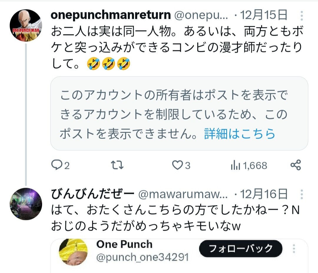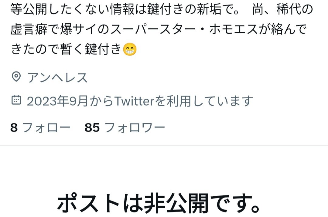 数年前からグループでアンヘレス垢などに誹謗中傷(巻き込まれ被害者)を繰り返したから、あまりにアンチが多すぎて鍵垢にしたくせに凍結された。正論は相変わらず無限の承認欲求が抑えられずに性懲りもなく掲示板にも頻繁にコメントし、必死すぎて大爆笑。