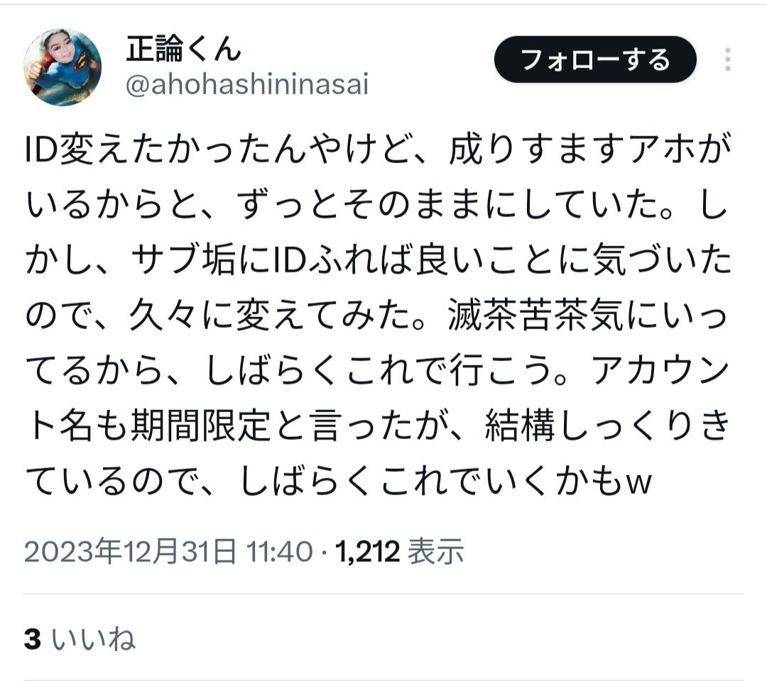 キモいNおじ批判で捨てアカ使い日本人さらしの知能が低い承認欲求コロナ脳twitter民正論くん(改名)が承認欲求害虫や「スネ夫みたいなアホ」に続き、必死にTwitter名やIDを変更し、また自爆した。自ら犯行を認めたようなもんだ。アプリを復旧次第チン◯スくんの証拠コメント画像を貼るからね。ブログのキモい必死コメントも読んであげてね。