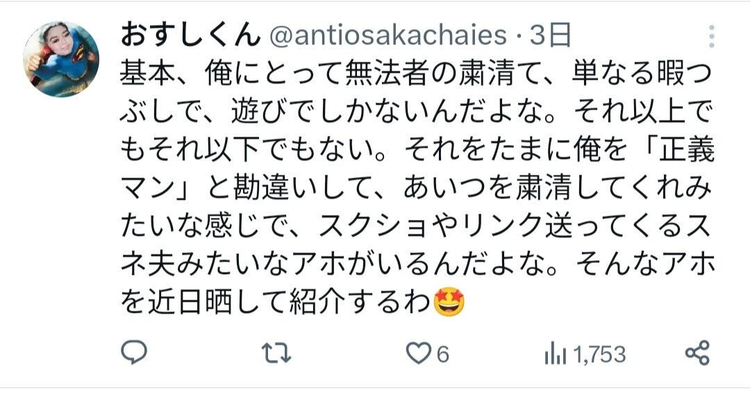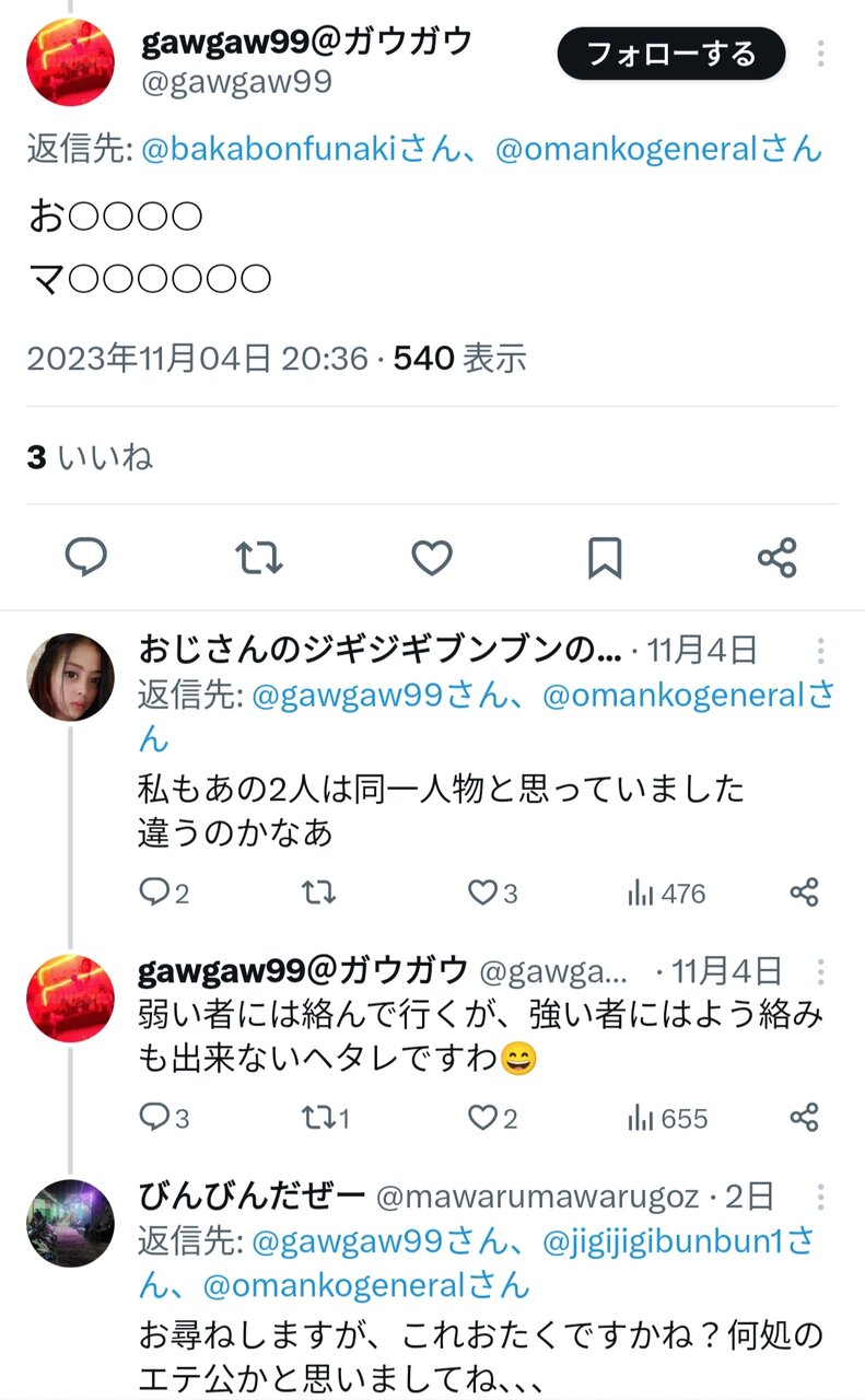 キモいNおじ批判のとにかくマウントが取りたい偉そうな承認欲求コロナ脳twitter民おすしくんが承認欲求害虫に続き「スネ夫みたいなアホ」とまた自爆している。結婚しててサラリーマンだから、Nおじを他人にさらさせ、捨てアカを使ってるみたいなことも言ってて、3つのアカウントと連携し、キモいNおじ批判や日本人の写真をさらしている。これが本人でも仲間でも相当ヤバいが、サラリーマンならコンプラ違反でクビ案件だ。下の東南アジアのとびんびんだぜは同じ写真を使い、日本人をさらしているから、同一人物か仲間なんやろ?4つのアカウントの知性がない痛い文面がほぼ同じだから、開示請求待ったなしか?お前を批判してるツイートに写真をさらしてるから、バレバレやぞ?タイミングもバッチリでアスペもお前のことやがな。