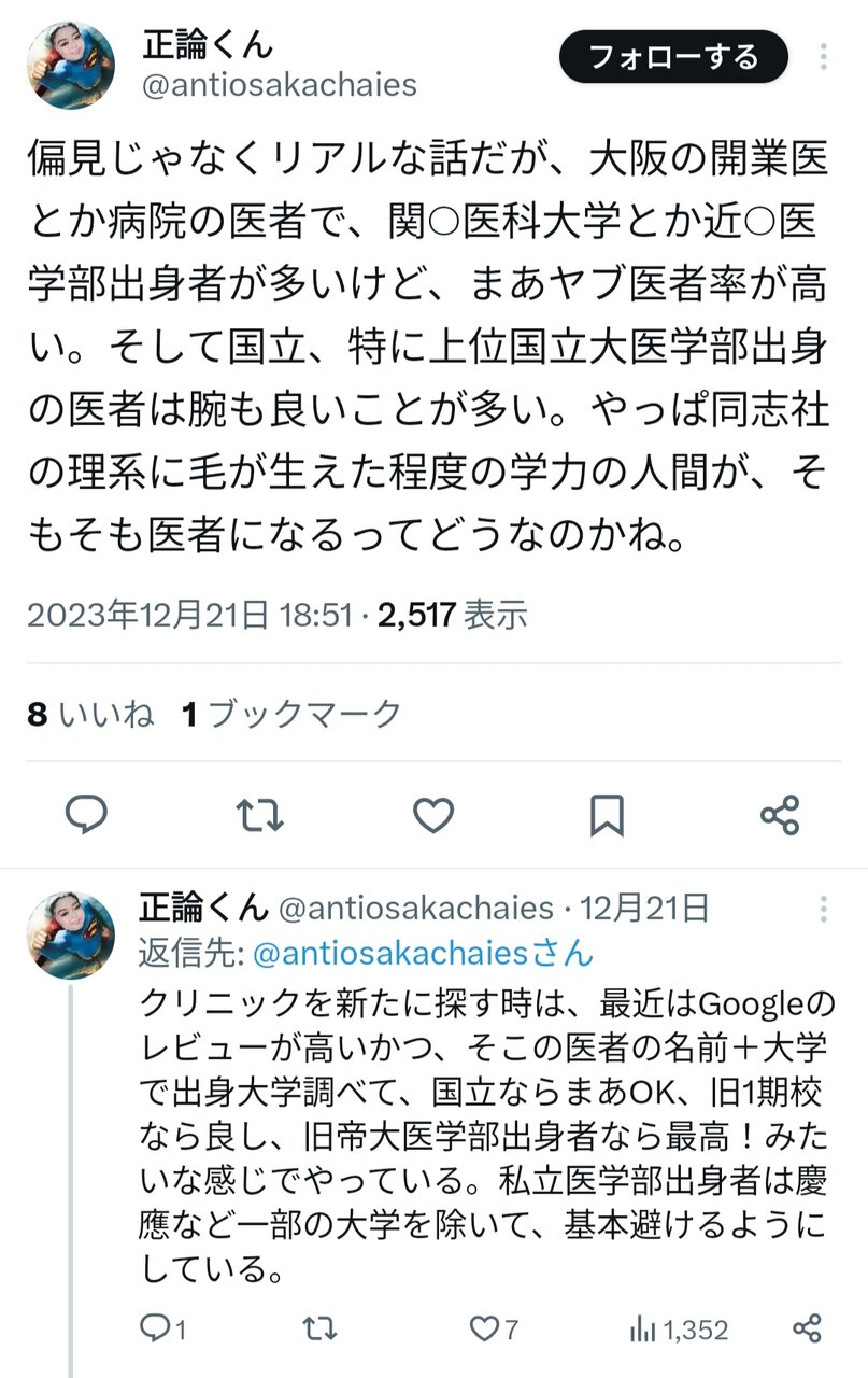 - 製薬利権の旧帝大の医者や学者が金儲けのためにコロナ風邪や接種、マスクなどのウソを吹聴したせいで日本の病人や死者数が急増しているのに未だに医者の学歴ガーと騒ぎさらに爆笑。知能が低いコロナ脳らしい思考。