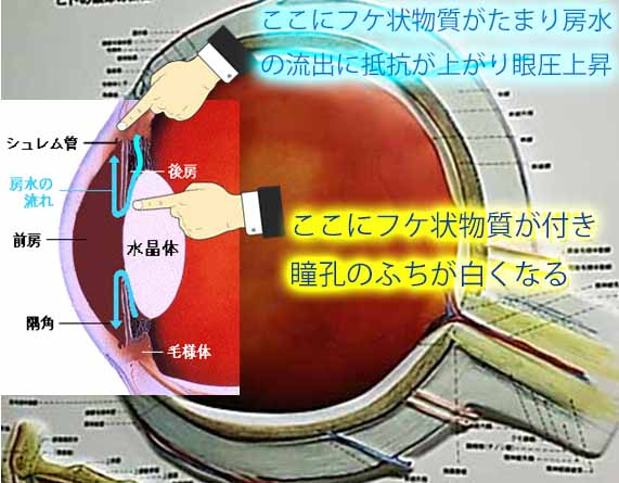 落屑膜症候群とは、目の中にフケのような白い物質が飛散し房水(眼球の中に流れている水でこれの流れが眼圧の大きさに影響する)の流出路に沈着して眼圧を上昇させ、瞳のふちに沈着すると瞳が白くなる病気です