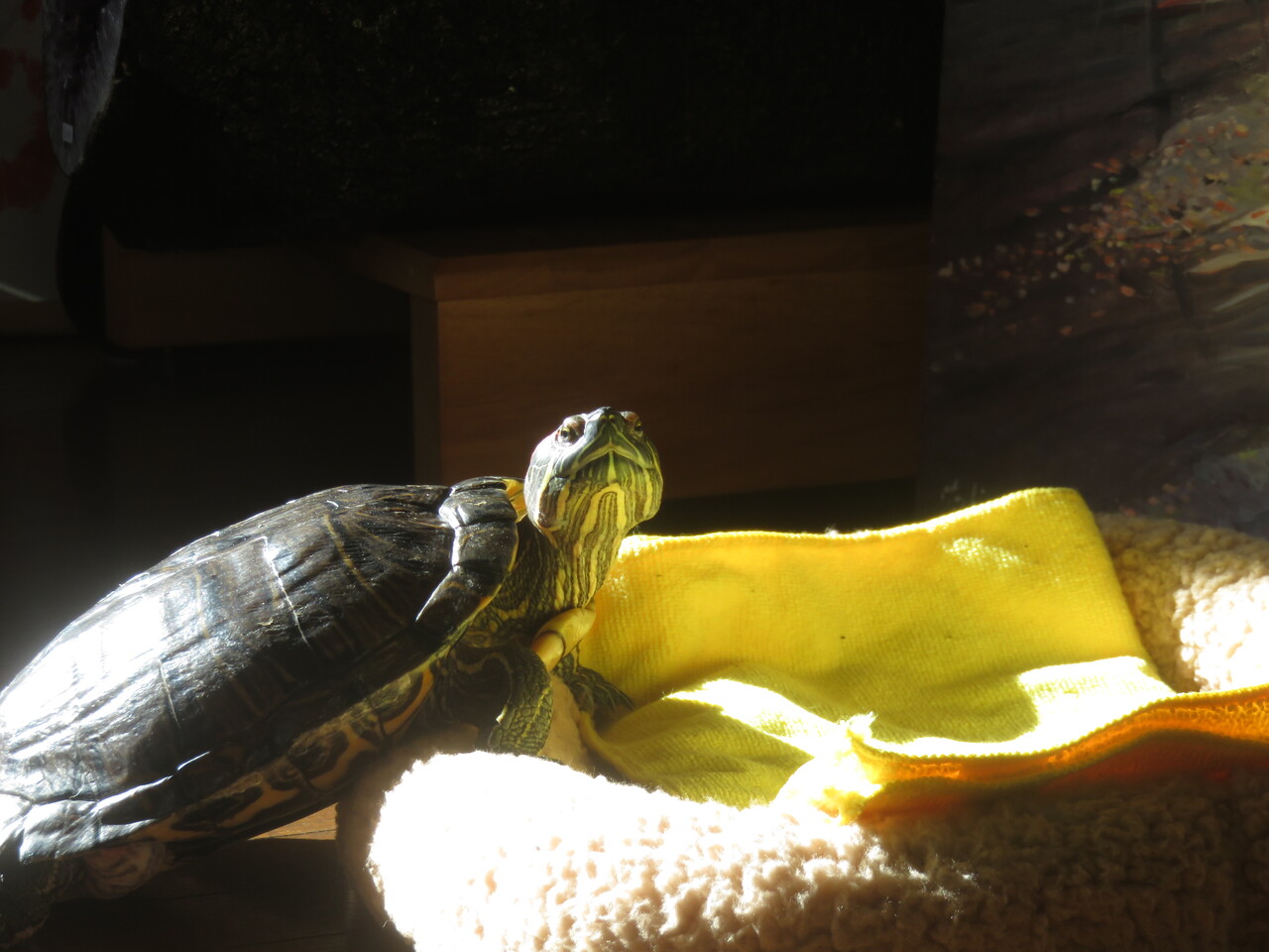 太陽光が当たる場所に行って甲羅干しをするメカコ