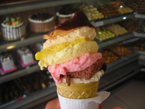 下から、バニラ、チョコチップ入りチョコ、フランボワーズ、レモン、オレンジ、バナナ、カラメルで、チョコソースもつけてもらいました。