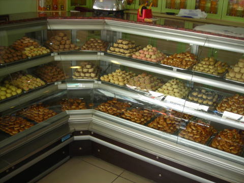 下2枚の写真の棚の上は、ポアチャという塩味のパンです。