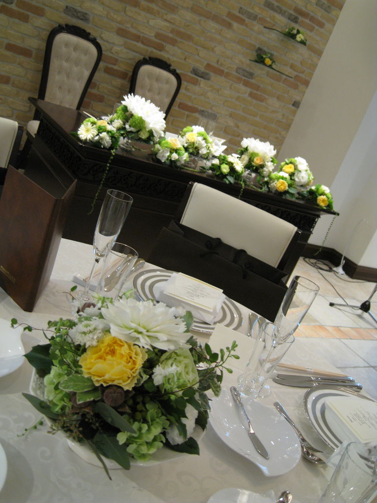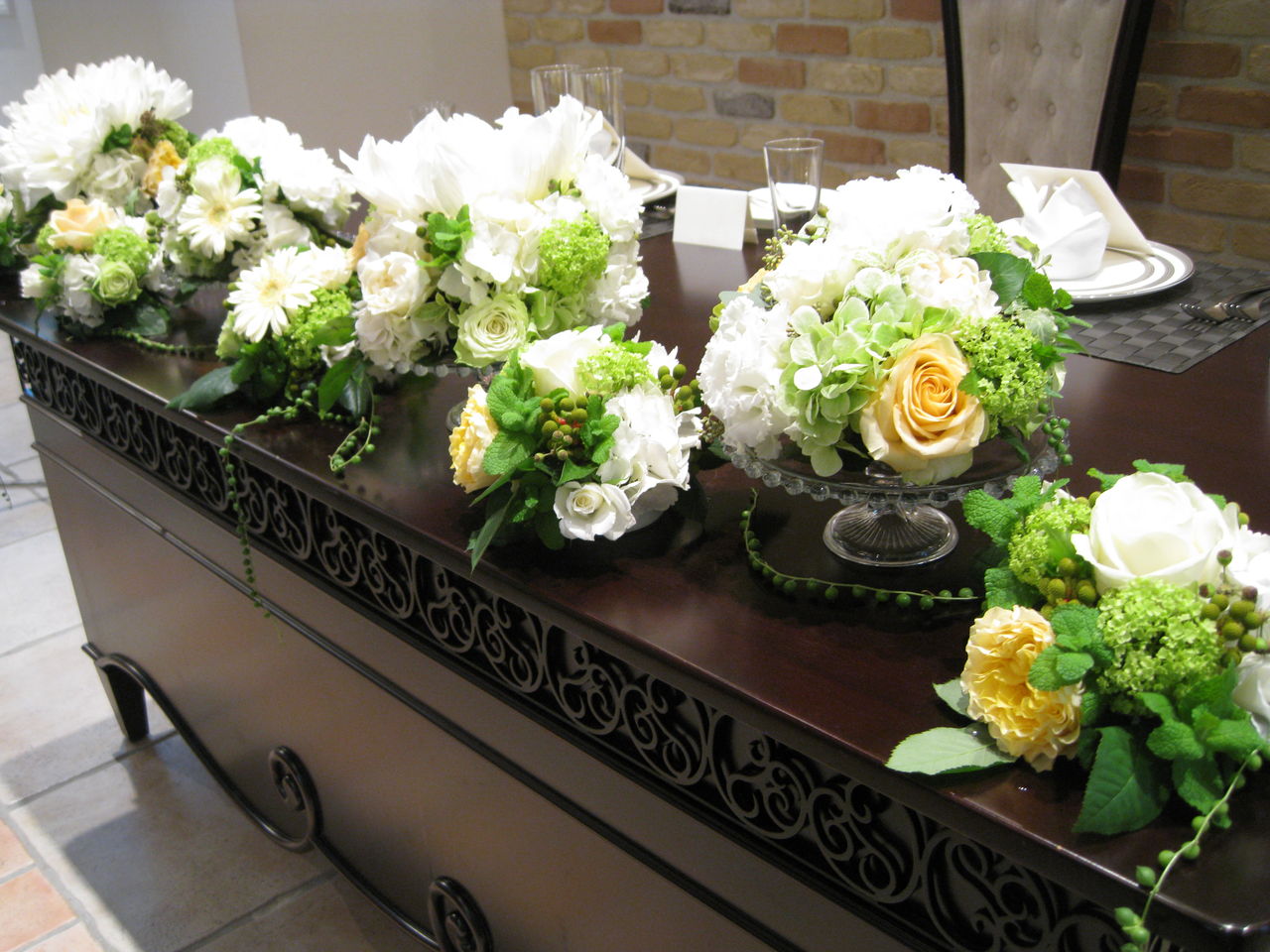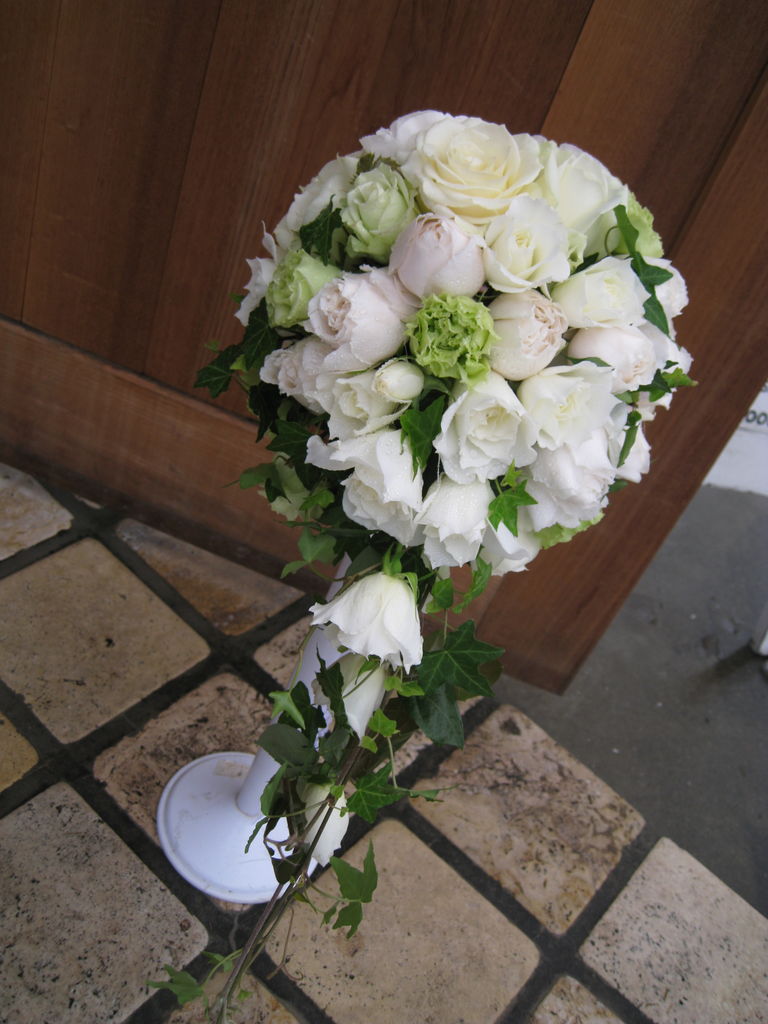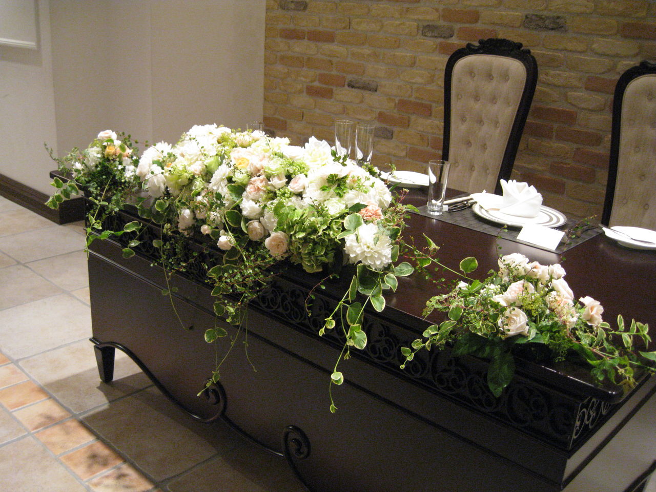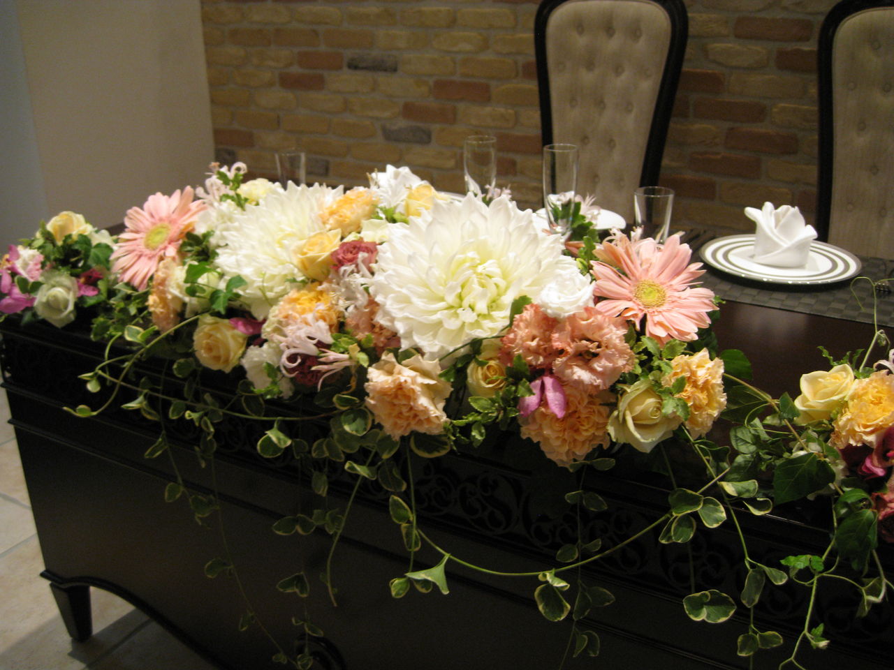 今年初めてのブライダルです。階段に下げたイニシャルは、手づくりで土台を作り、それにコケをワイヤーで、止めたものです。
