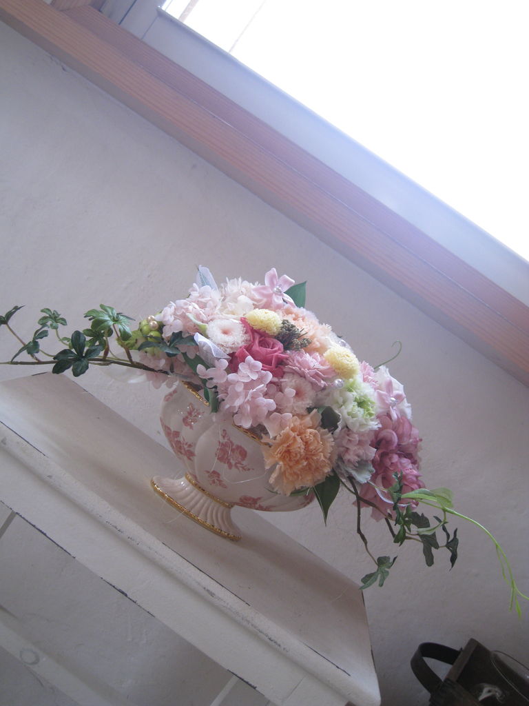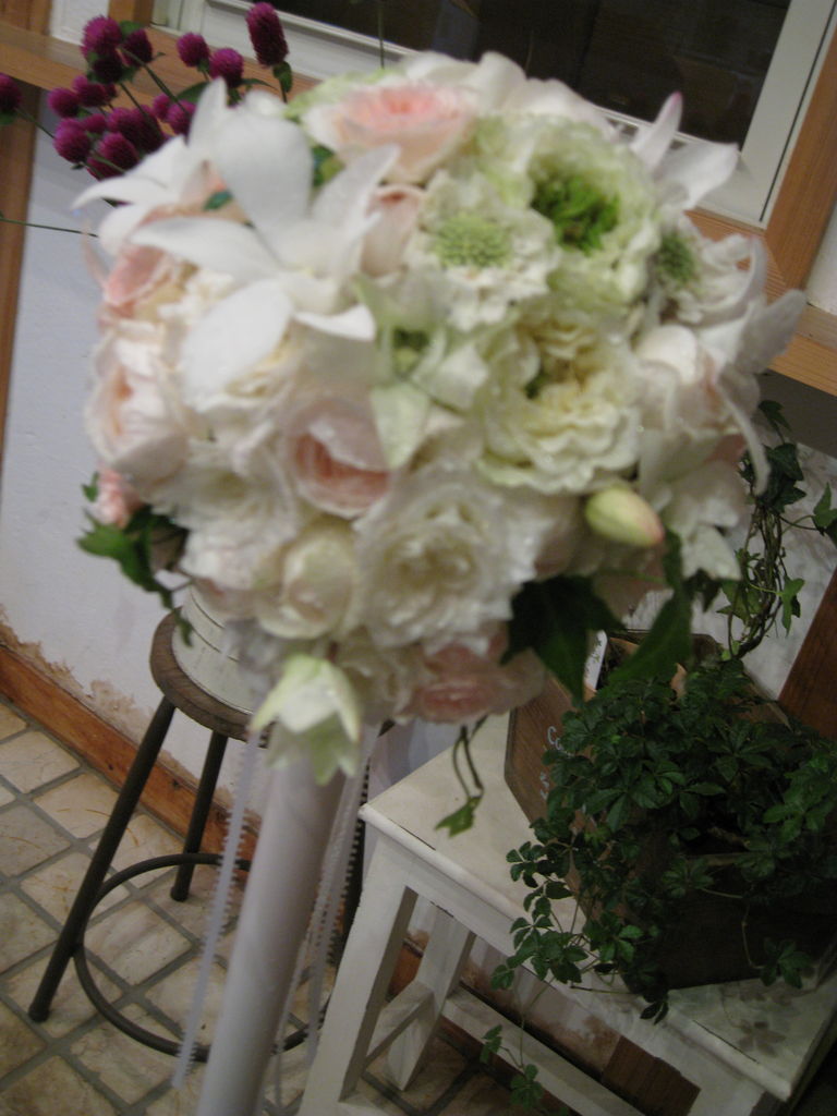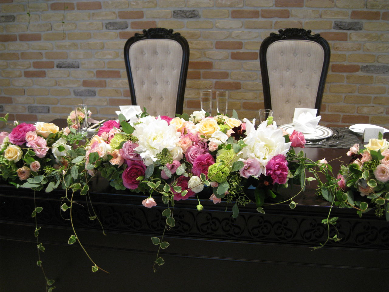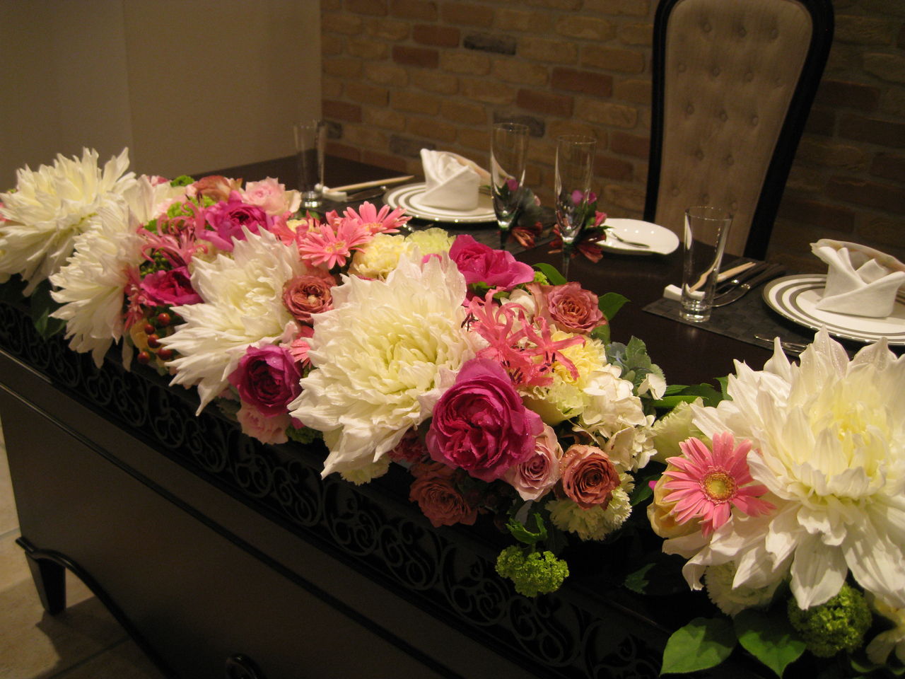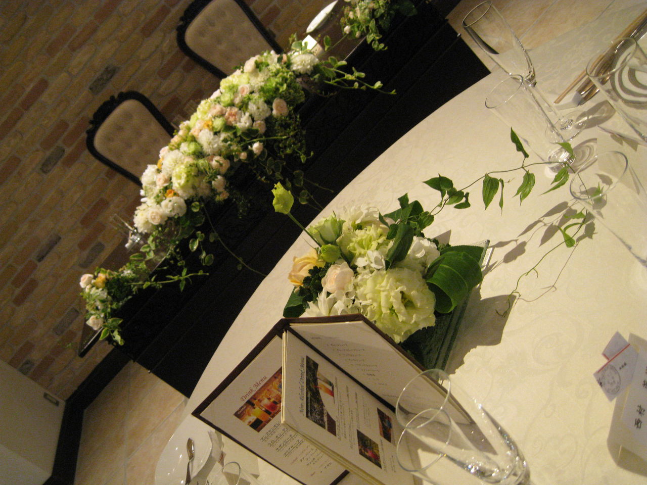 今年初めてのブライダルです。階段に下げたイニシャルは、手づくりで土台を作り、それにコケをワイヤーで、止めたものです。