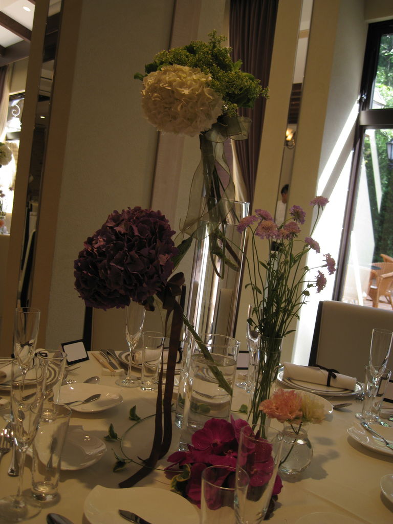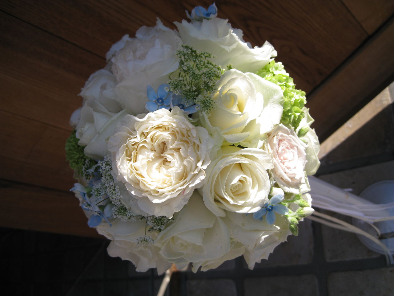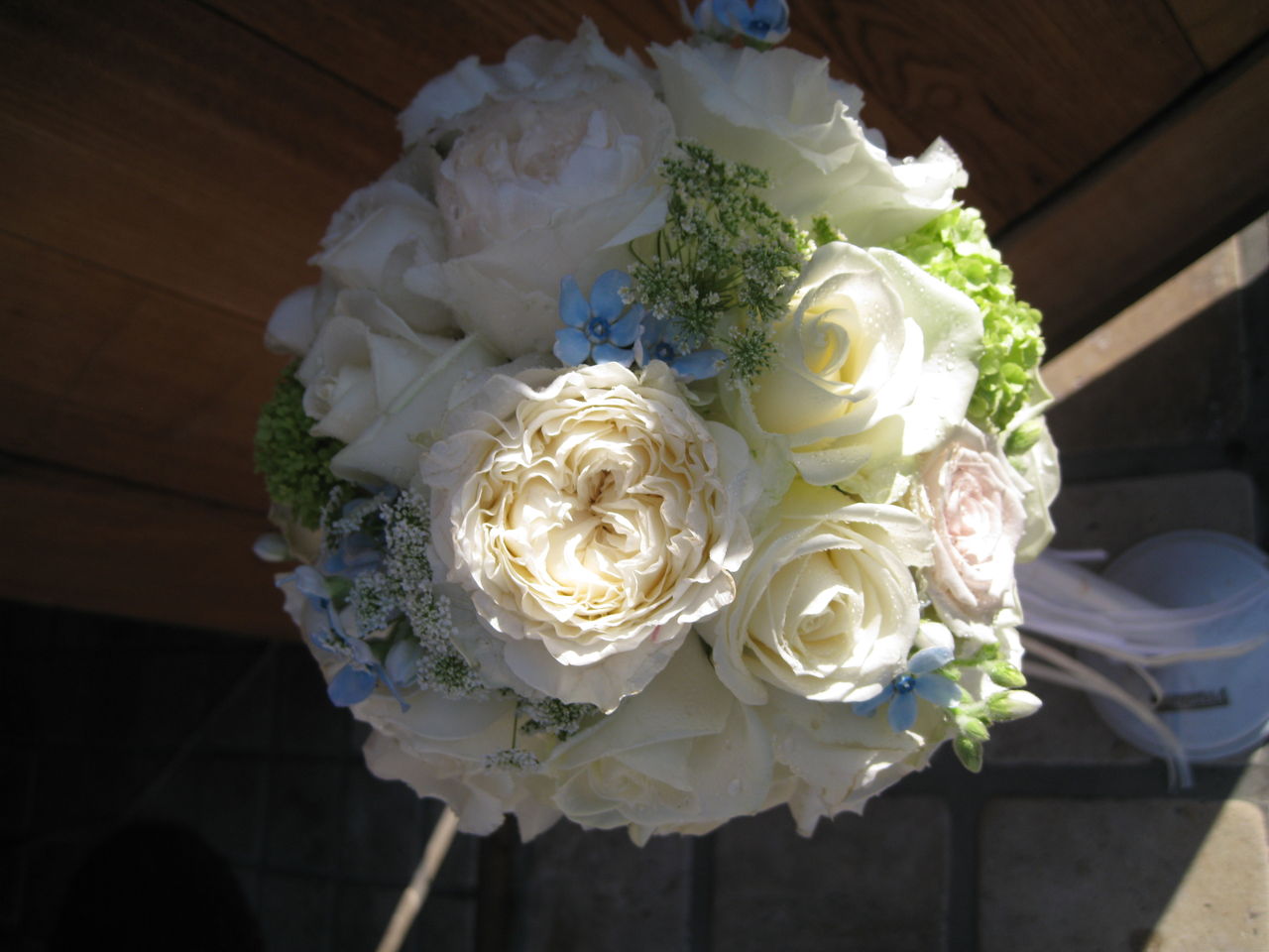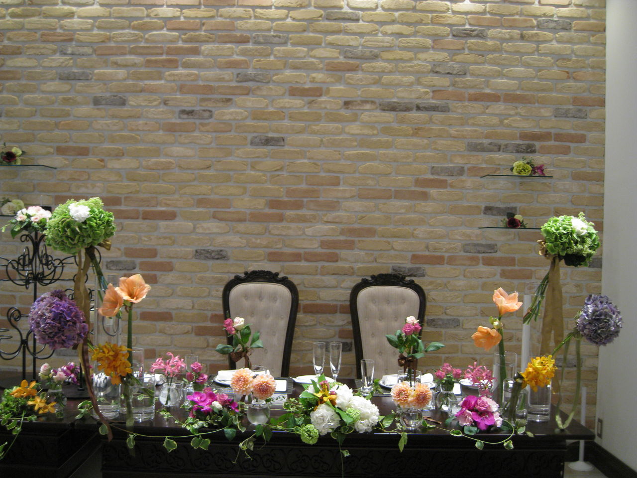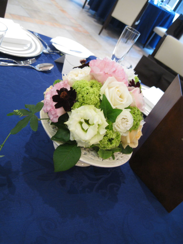 今年初めてのブライダルです。階段に下げたイニシャルは、手づくりで土台を作り、それにコケをワイヤーで、止めたものです。