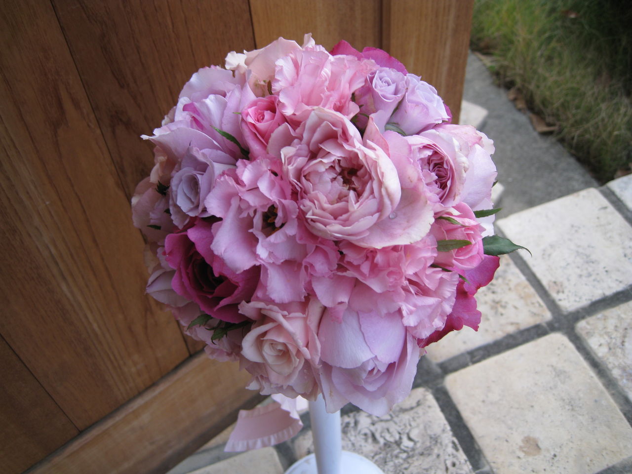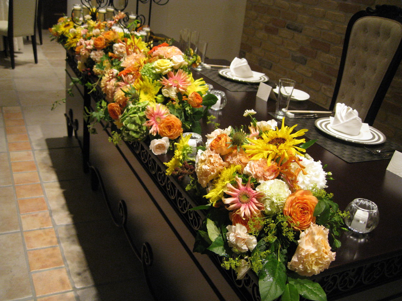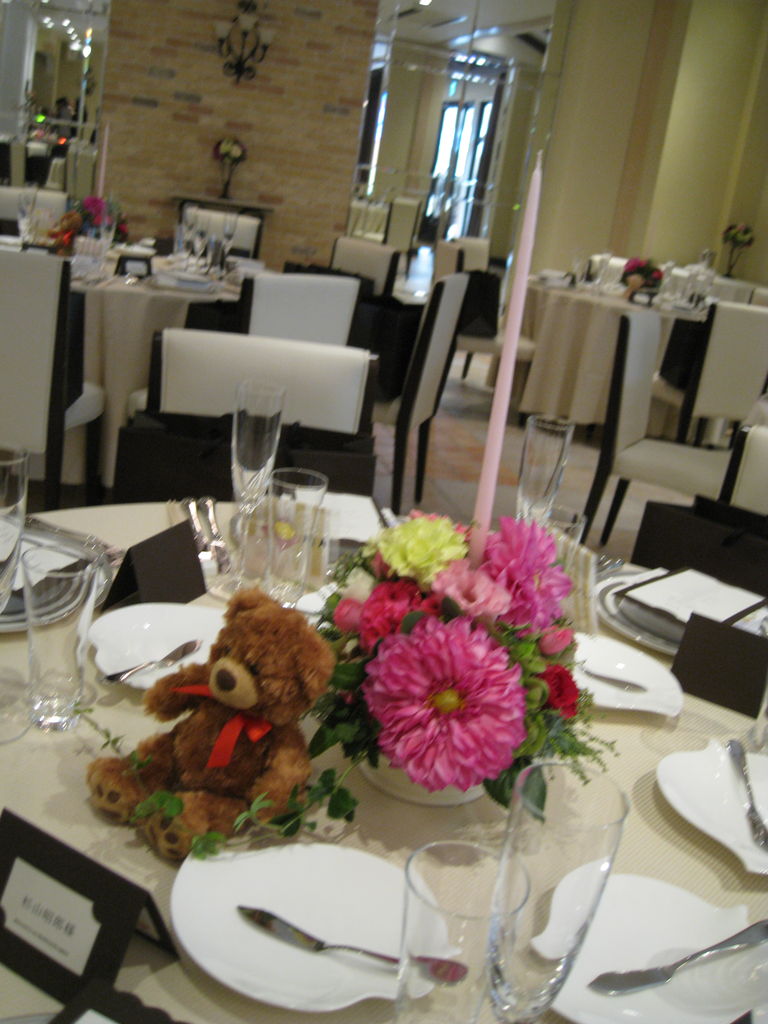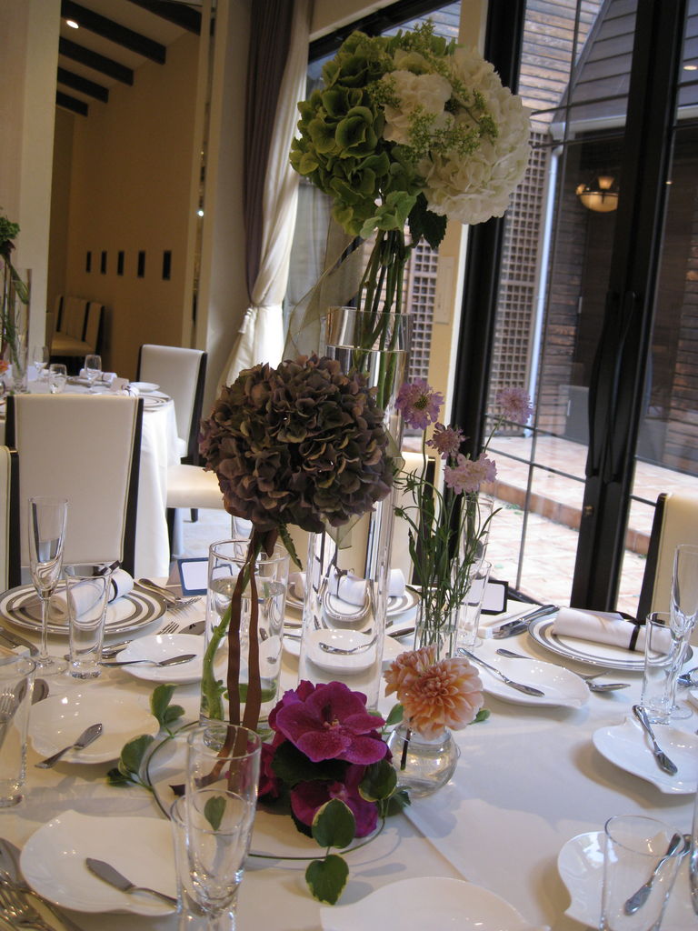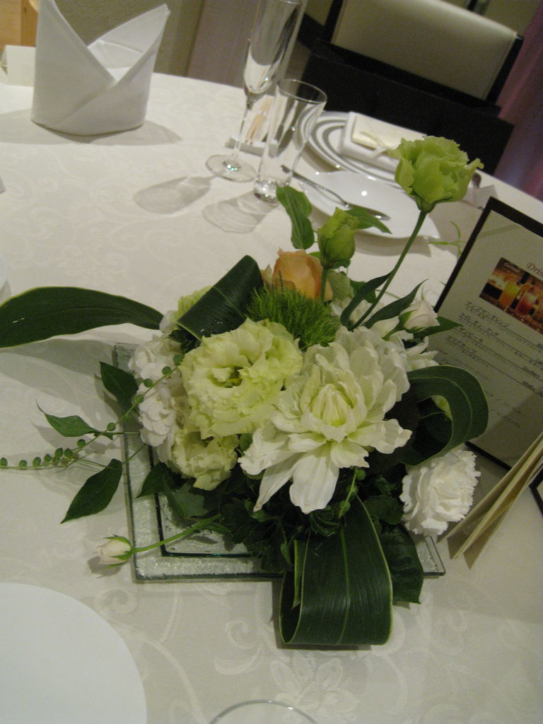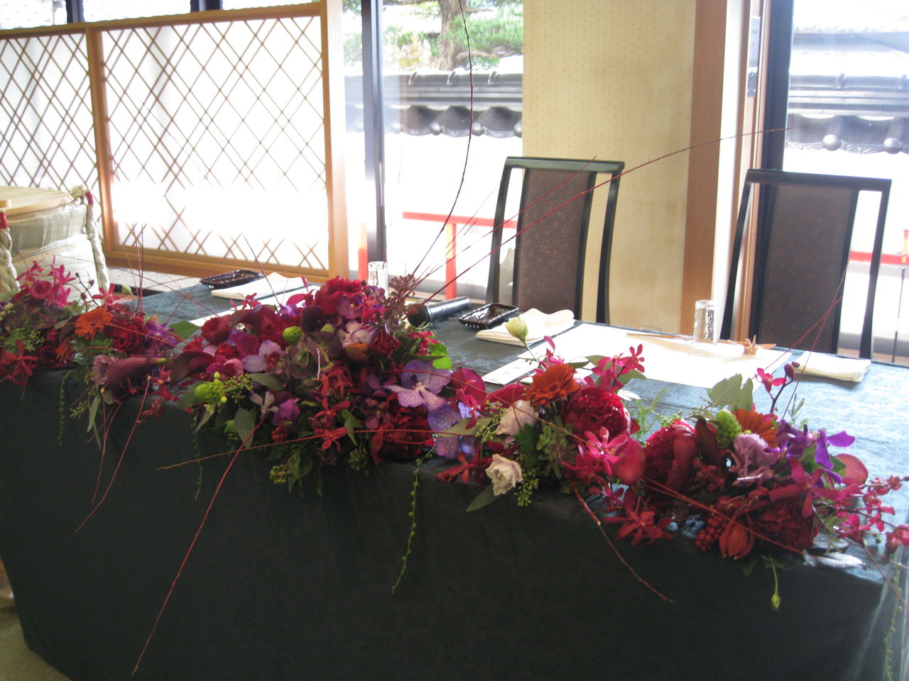 今年初めてのブライダルです。階段に下げたイニシャルは、手づくりで土台を作り、それにコケをワイヤーで、止めたものです。
