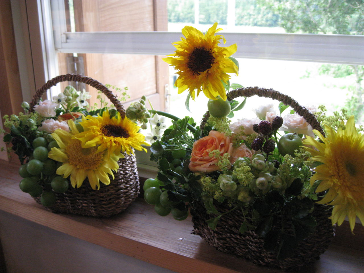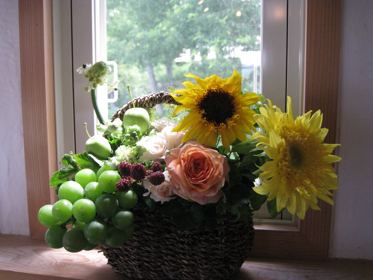 今月の、教室です。果物とフレッシュを使ったアレンジです。