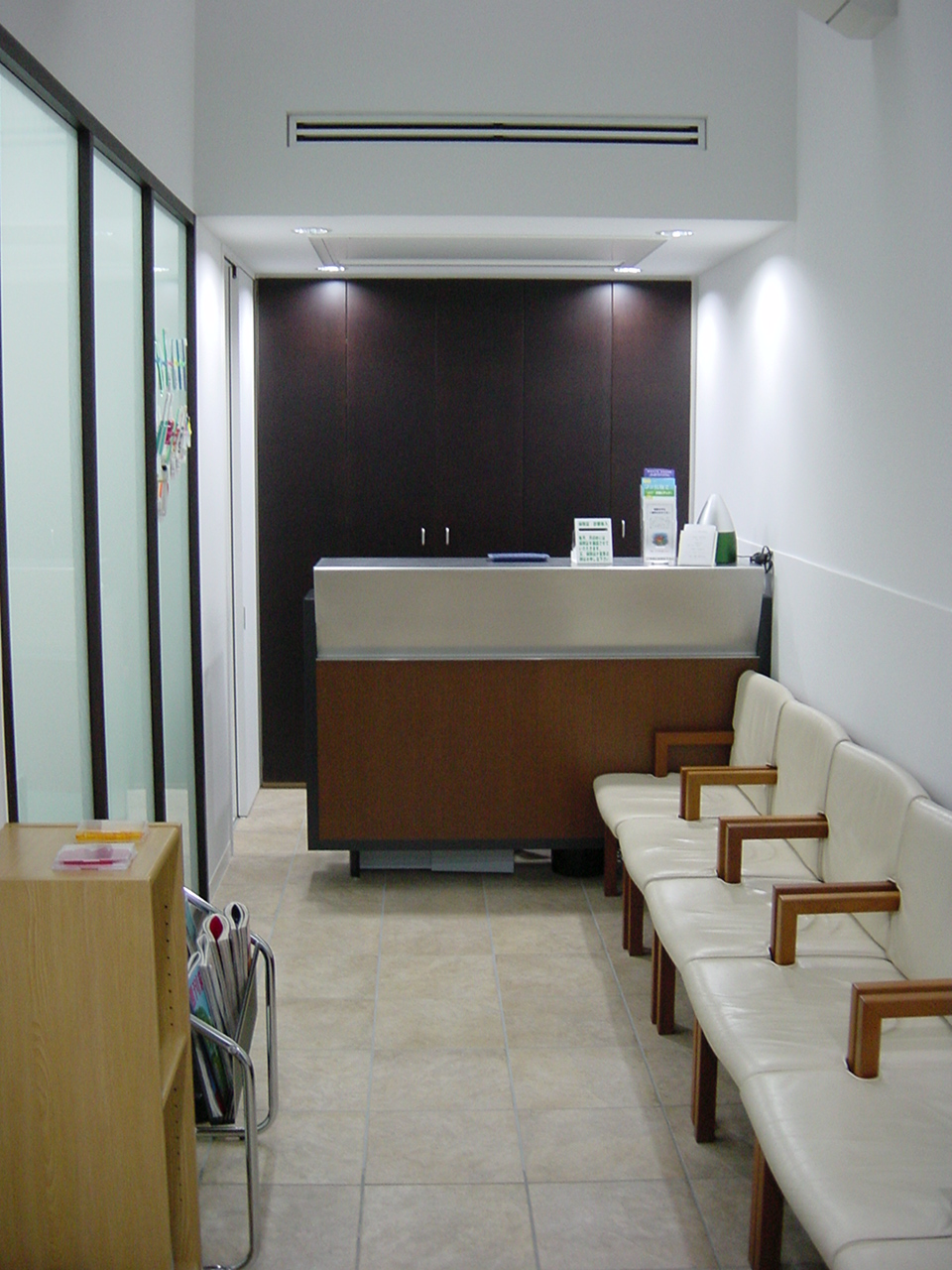 写真は、入り口から見た待合室です。ドアを開けて左手に受付があります。