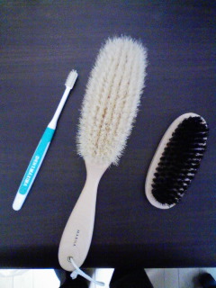 写真は、私が毎日のようにお世話になっているブラシたちです。左から、ハブラシ、服ブラシ、靴ブラシ。