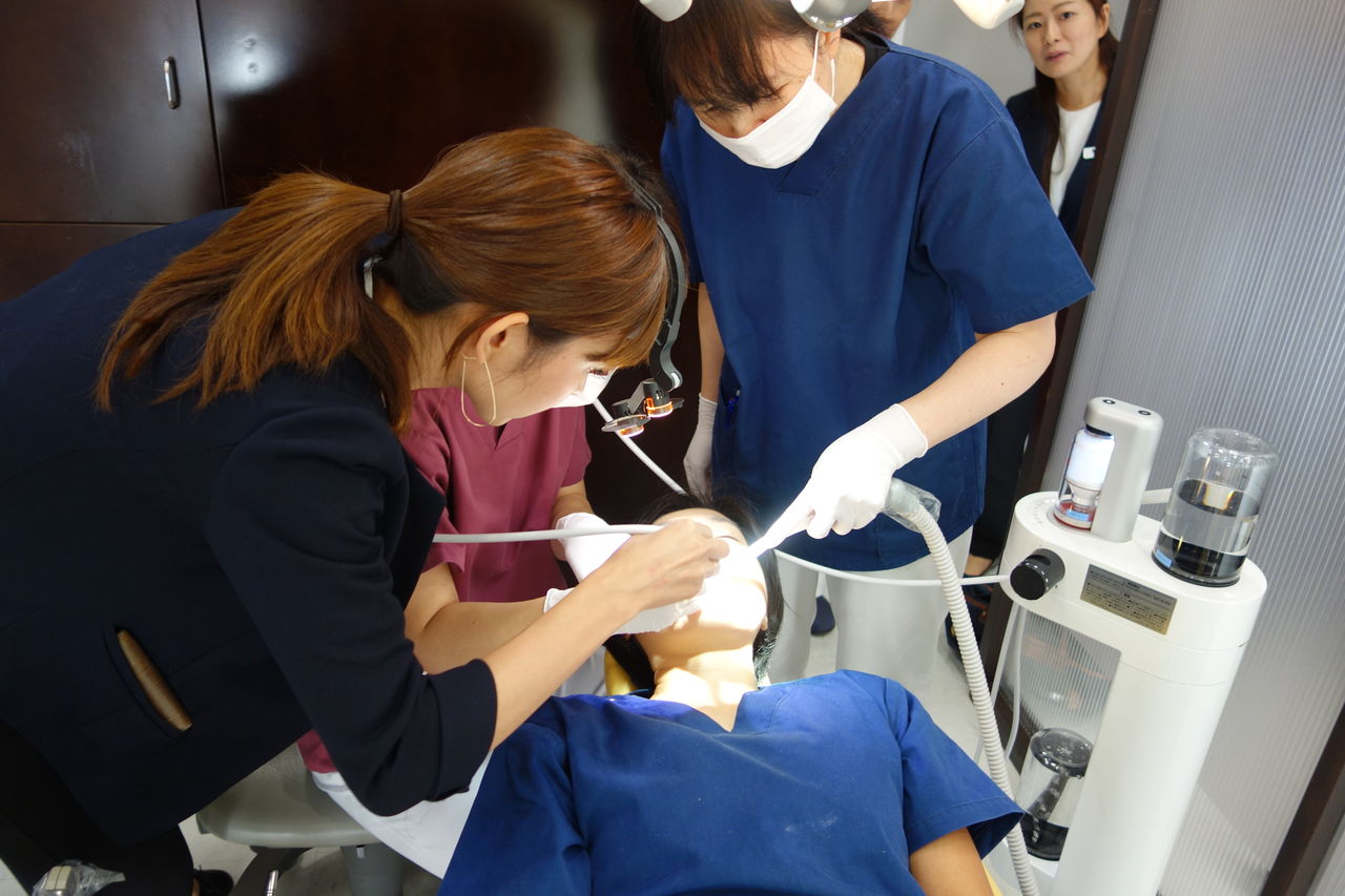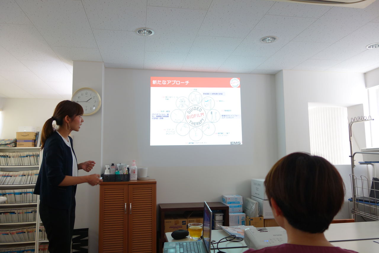 昨日の院内勉強会では、EMS というメーカーの歯科衛生士さんと器材担当者の方においでいただき、ミニ研修会を行いました。