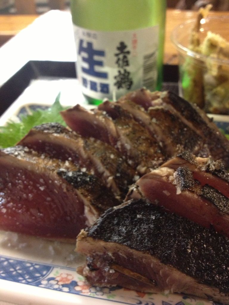 ひろめ市場のカツオの塩たたき。日本酒とよく合います