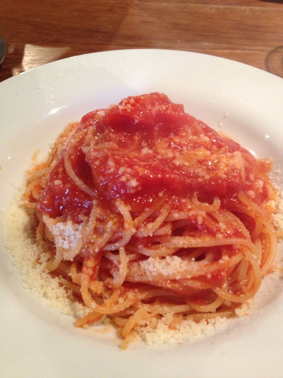 トマトソースのパスタ。パスタはスパゲッティーニ?ちょっと細い。トマトだけなのにうますぎ、不思議だ・・・