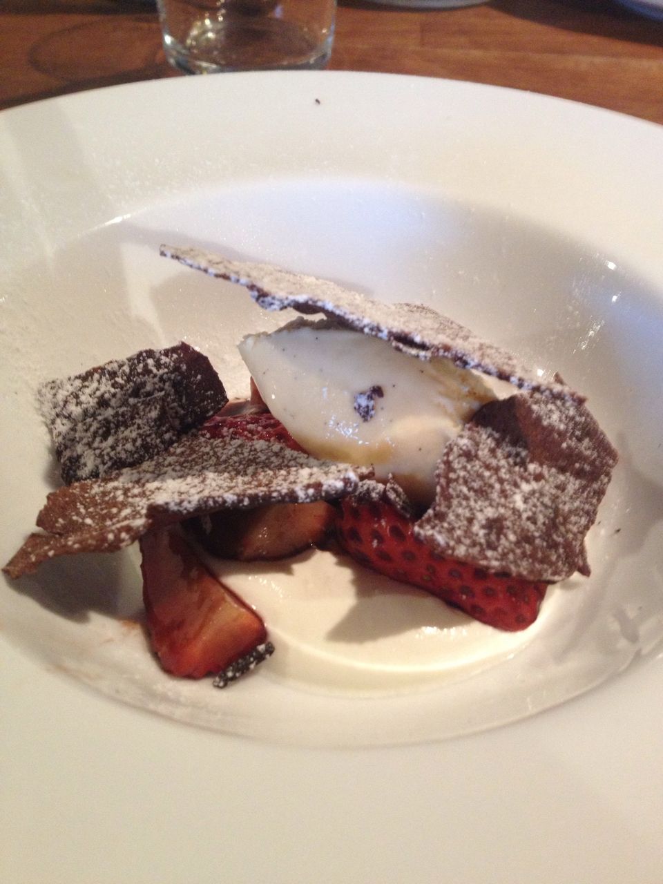 デザートのいちごのなんとかマリネ。ちょびっとバルサミコ酢入ってて酸っぱい。これもとりあえずうまい・・・。