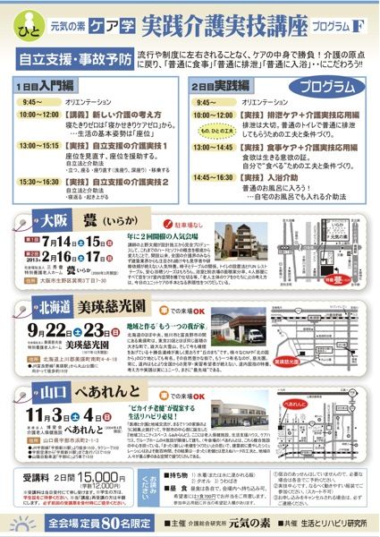 元気の素ケア学 実践介護実技講座(プログラムF)』を下記のとおり開催。2日間・全課程に共通する、《普通のやり方》をするための《特別な工夫》のコツを、実技中心に楽しく体験してください!