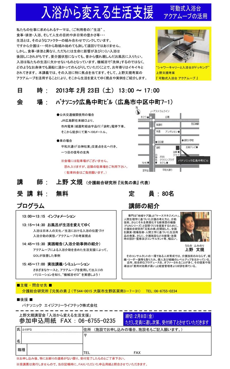 その導入・活用していただくために…必要な介護観と、ワンランク上の技術・活用法と、費用対効果までをも加えた内容で、介護専門職のみならず、福祉用具販売従事者等も巻き込んで、今年2月に広島(中国地区)で行われた話題の研修会『入浴から変える生活支援 〜可動式入浴台 アクアムーブの活用〜』でしたが…