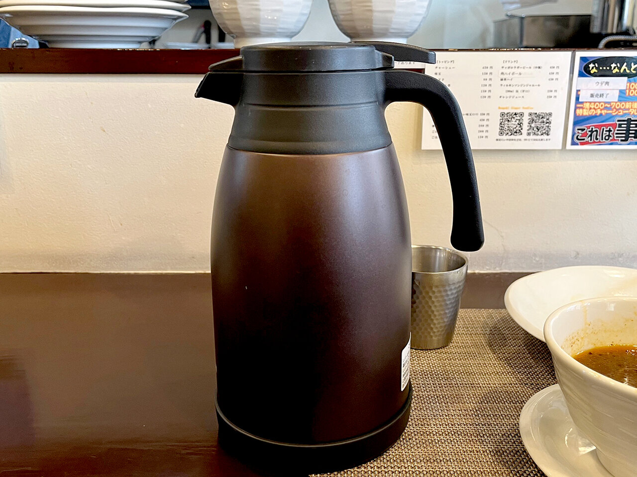 ほどなく提供…つけそば。”荻窪丸長オマージュ“とされるつけそば。麺壁的解釈のオールドスタイル。ブラッシュアップされて意外に新しい? ギュッと密に感じられるストレート太麺の中央には刻み海苔。濃いめの醤油つけ汁には黒胡椒が効かせてありさらに旨味あるラー油が主張する麺壁流。つけ汁には短冊の叉焼ごろごろ。メンマたっぷり。そして刻みネギ。気がつけば最後まで飽きることなくサクッとね。割りスープはポットでの提供。あっという間に完食・完飲。満足。ご馳走さまでした〜♪