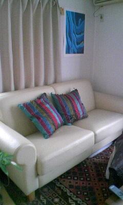 昨日うちにソファーがやってきました。友達がマンションを買った時に家具として付いてたソファーを子どもが登って危ないから、と私達にくれたのです!我が家にも一応カウチありました。まくさんのアンティークの木のベンチタイプが。全然快適ではなく、荷物置き場と化していたので本物のソファーがやってきて本当にうれしいです。ソファーでくつろぎながらDVD見たり、ごろんと横になったり…生活がまるで変わりますね、これは。