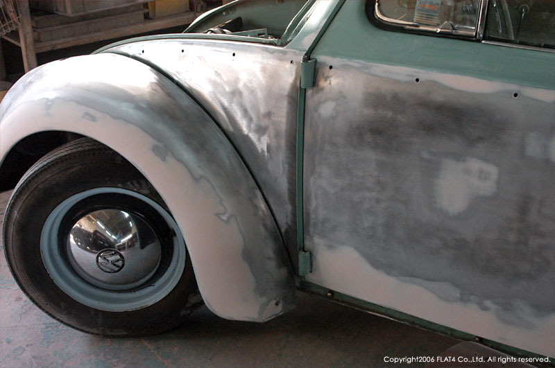 続いて部分剥離した箇所から順に、サフェーサーを吹いて下地処理を行っていきます。サフェーサーはボディの鉄生地にペイント塗装をしっかりと密着させる役割をしますので、ムラなく素早く塗布した後、入念に磨いて表面をスムースにしていきます。