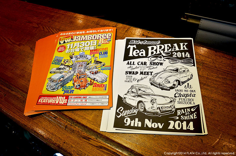 爽やかな秋晴れが続く過ごしやすい季節となり、空冷VWオーナーの皆様も楽しいドライブをお楽しみの事と思います!いよいよ来月には、静岡県袋井市での「Tea BREAK '14」、東京お台場での「8th. STREET VWs Jamboree」とビッグイベントが続き、空冷VWファンの皆さんにとっても楽しみな季節がやって来ました!そして、当社へも両イベントのフライヤーが届き、現在、店頭や通信販売をご利用いただいた皆様にお配りしています!