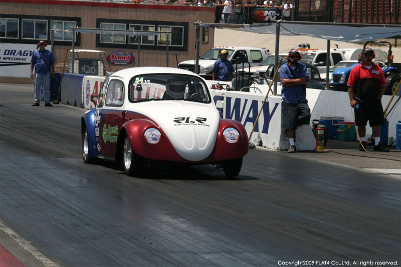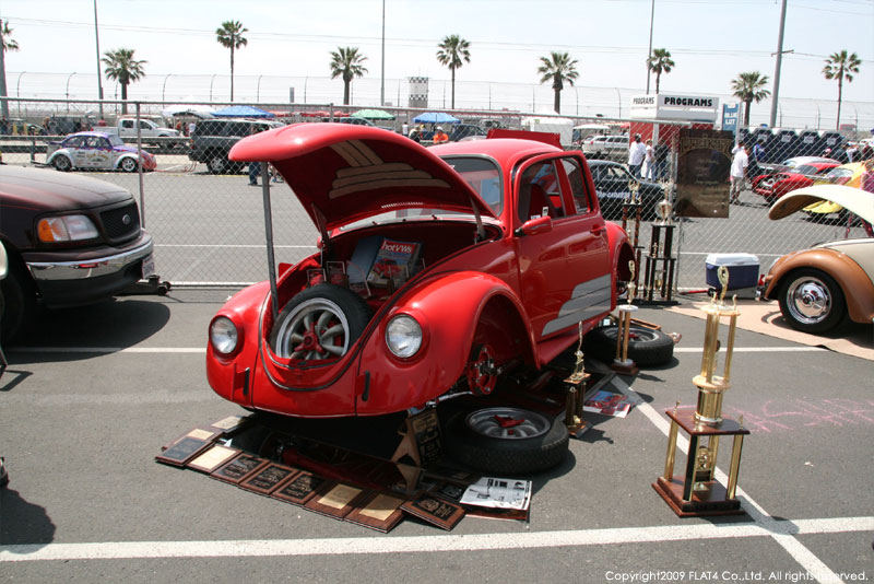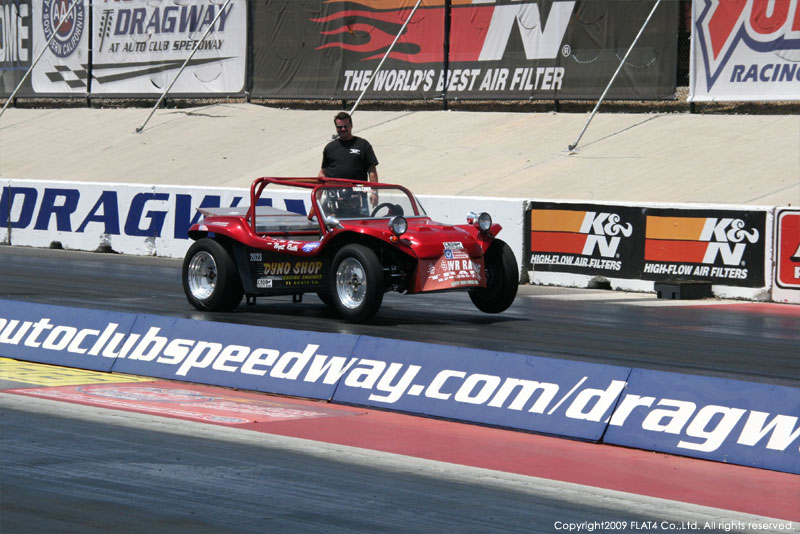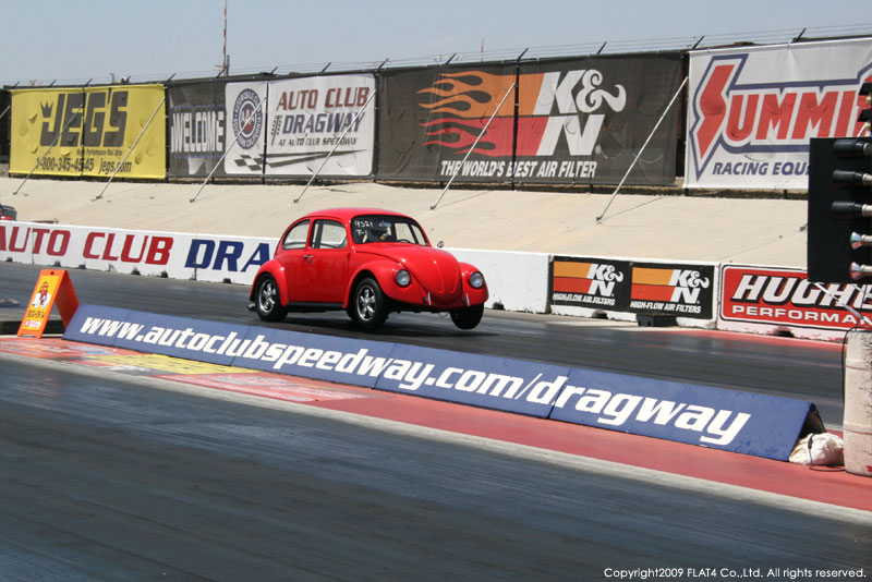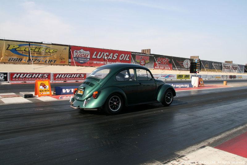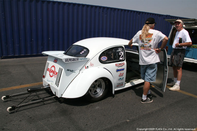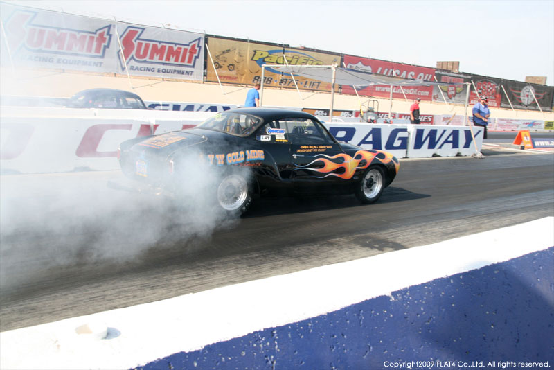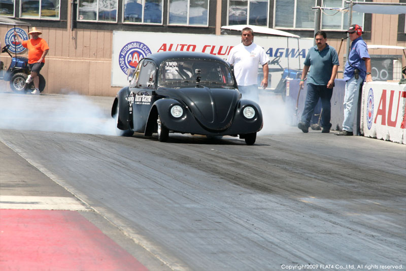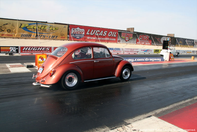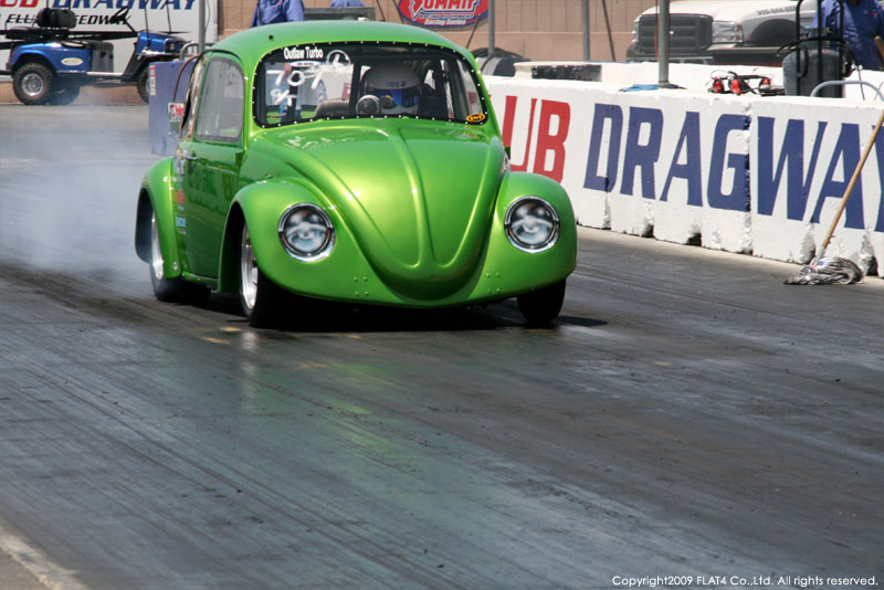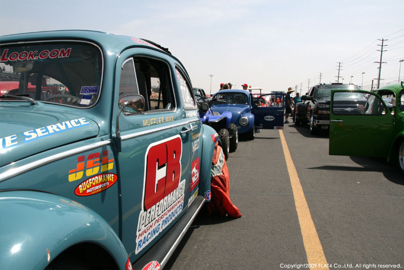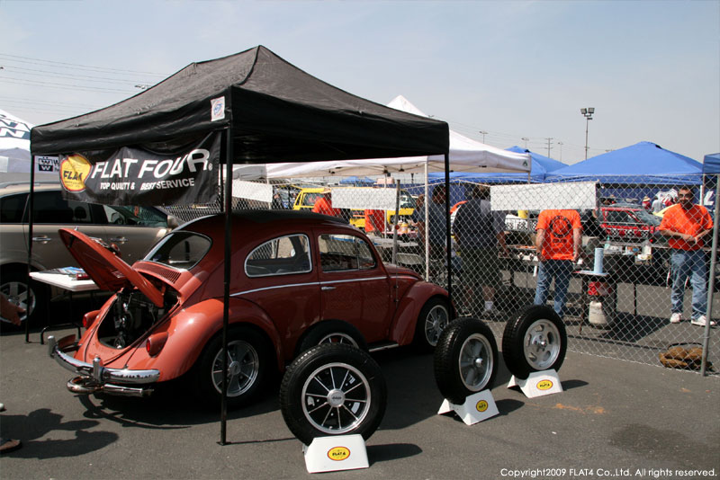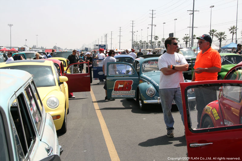 オレンジカウンティから約1時間ほどにあるフォンタナの会場「AUTO CLUB DRAGWAY」では、朝からDyno Donのボイスが響き渡ります。やはりDynoのボイスはカリフォルニアのイベントには必要不可欠!!一気にテンションが上がります!スポンサーブースを用意されたFLAT4ではリニューアルしたBRMをプロモーションです。オリジナルBRMを履くVWとして恐らく世界で一番知られるBill Schwimmerに協力してもらい、彼にFLAT4 BRMを履いてもらいました!彼もFLAT4 BRMのディテールには大満足!!