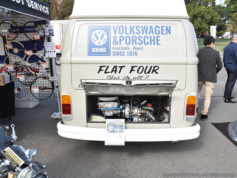 展示車両の隣には、リリースしたばかりのRLR x FLAT4 ターボチャージャーKITを搭載した1974 TYPE-2 レイトをディスプレイ。日本初登場のKITという事で多くの方に興味を持って頂き、お問い合わせにスタッフが対応させて頂きました。