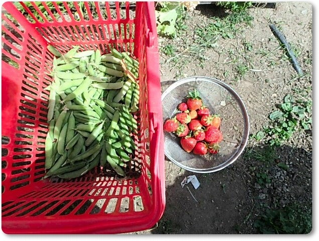 イチゴとエンドウ、奇跡的に育ってたスナップエンドウ。