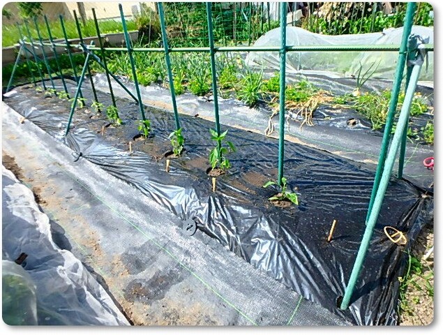 手前から、「豊年ピーマン」5株・「甘とう美人」3株(もしかしたら4株かも)・「サラダピーマンパープル」2株(もしかしたら3株かも)